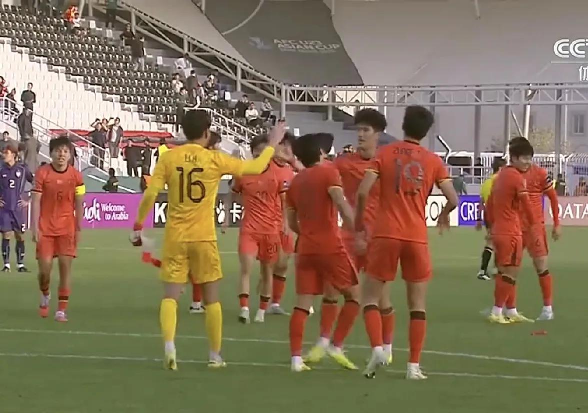 U23国足亚洲杯赛事历史上第一次小组出线,跻身八强! 以小组第一进入淘汰赛,太棒了! 中国队小组赛第三轮比赛中,与泰国队0-0踢平。 这场球中国年轻人,被泰国队员不要命般的疯狂拼抢踢得人仰马翻,还在裁判照顾下,上半场早早领到3张黄牌。 但他们顶住了场内场外的不利因素干扰,顽强地拼到终场哨声响起,实现了确保小组出线的比赛目的。 为U23国足喝彩点赞!
