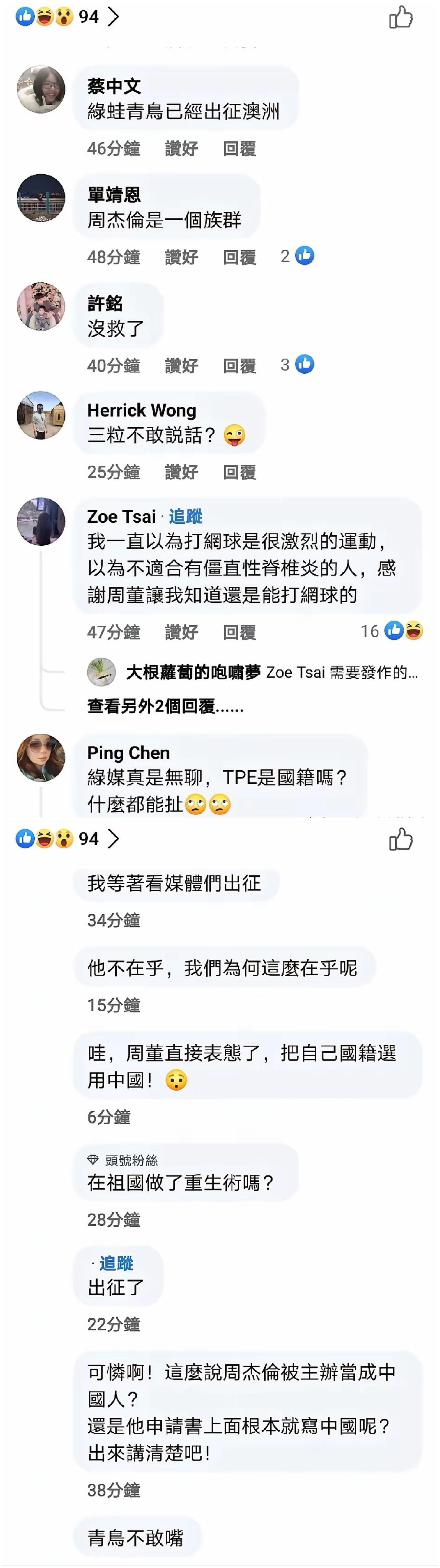 周杰伦国籍选择CHN三个字,让岛内青鸟们破防了。 在近日的澳网一球制胜的舞台上,周杰伦选择了CHN作为国籍,成为持外卡的参赛选手。 本来就是一件娱乐的网球活动,结果因为周杰伦在填写国籍时,选择CHN而不是TPE,岛内的青鸟们破防了。 但令人诧异的是,青鸟们的表现却相当克制,不像平时会喊打喊杀。或许因为周杰伦的影响力巨大,如果过度施压会适得其反。所以青鸟们难得的畏手畏脚了一次。 其实我们就该让国际机构都做个修改,今后不论是台湾省,还是港澳,国籍都简简单单的三个字母CHN,不用再做区别了。毕竟都属一个中国了,再做区别意义不大。也让台湾省的人省得再花各种小心思,搞各种小动作。要么接受,要么不参加。看你自己咋选。 这一波无论如何都挺一波周杰伦,从那一首首中国风的热门歌曲,到大大方方承认中国人的认同感,到如今敢于在国际舞台用CHN表达自己的身份认同!他当之无愧是华人巨星。 大家讨论下,为何青鸟面对周杰伦会没了音量呢?