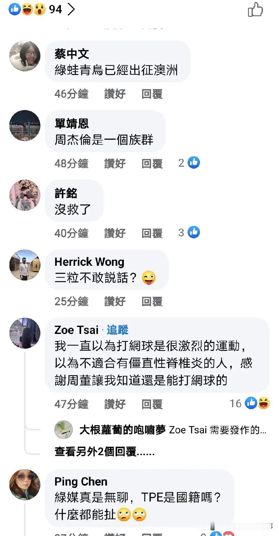 果然还是顶流,周杰伦一出手就爆了两个大新闻。 我刚开始还以为是同名同姓的人呢,毕竟从来没有听说周杰伦会打网球。而且还是澳网。 结果一看,居然是真的。 球技显然没有歌技好,一轮游,票友水平很正常,其实就是给赛事暖场的嘉宾。 第二个就是他的参赛信息让台湾岛内的青鸟集体红温。 现在很尴尬,不出征又觉得自己拿钱不办事会被上级敲打,出征呢,那可是周杰伦啊! 周杰伦在参赛国籍赫然写着CHN! 他说他是中国人啊,现在民进党的这些喽啰们该咋办? [笑哭][笑哭][笑哭][笑哭][笑哭][笑哭][笑哭] 点右上角关注我,我们一起去看这个魔幻的世界