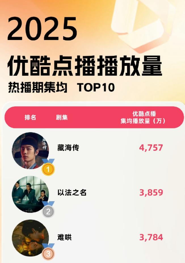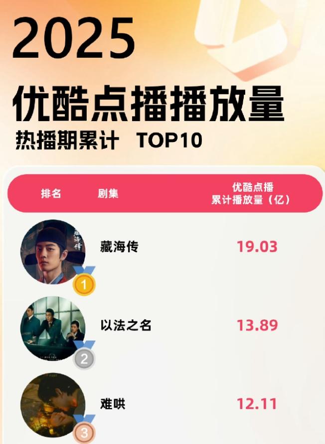 2025优酷热播期角色热度Top10! 酷云发布了优酷的角色热度榜单,这个榜单基本上是按照演员的流量大小排名,主要还是基于粉丝互动,流量打投出来的热度数据,以及剧集本身影响力,所以,孙俪,张译虽然剧播的不错,但是角色热度并不高,前十名分别是肖战,成毅,虞书欣,龚俊,白敬亭,侯明昊,杨洋,卢昱晓,张婧仪,张凌赫,优酷集均前三,点播量前三都是《藏海传》,《以法之名》,《难哄》。