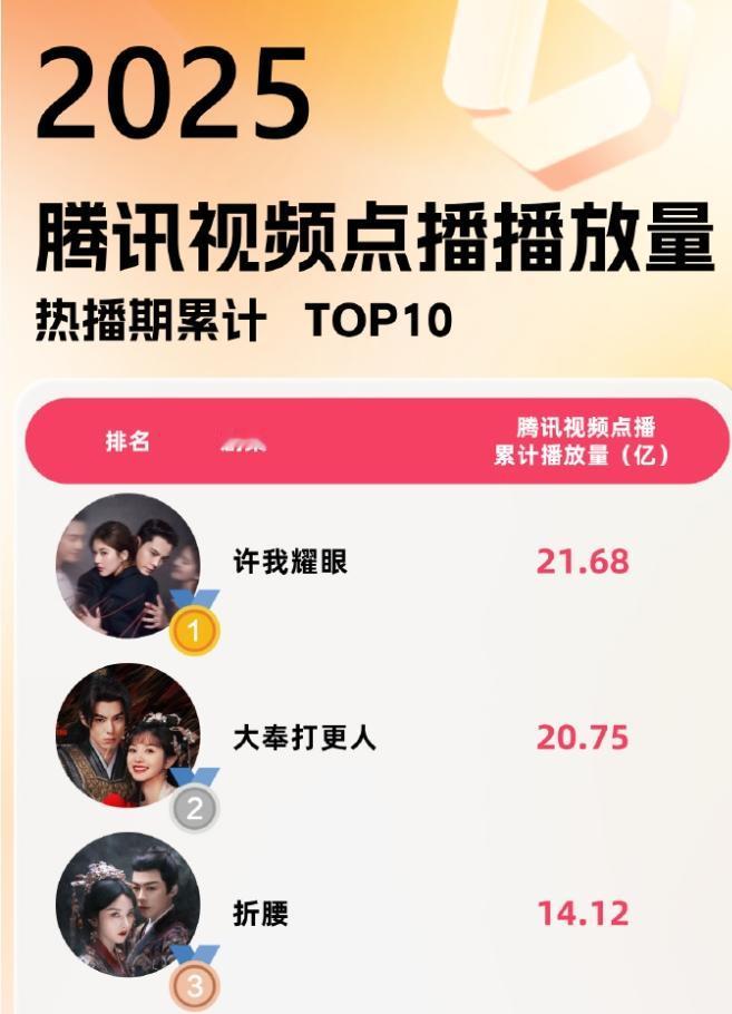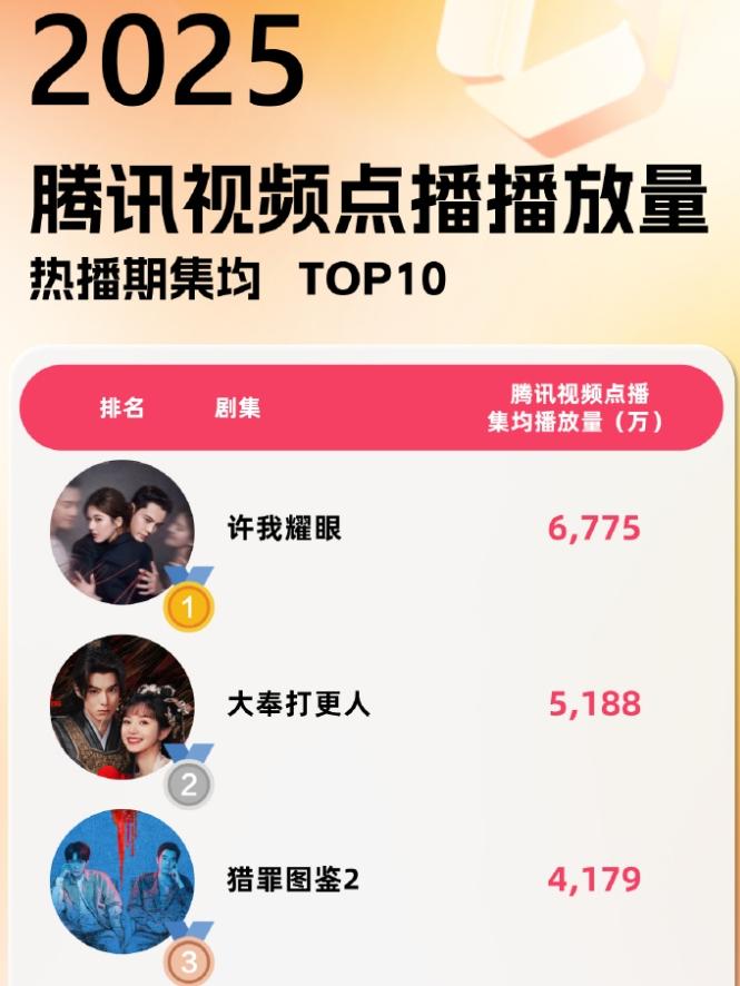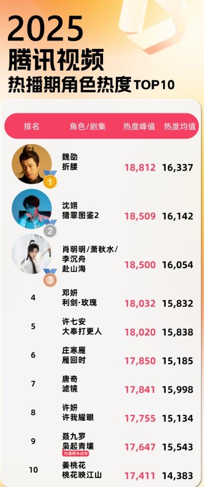 2025腾讯热播期角色热度前十! 角色热度前十是刘宇宁《折腰》,檀健次《猎罪图鉴2》,成毅《赴山海》,迪丽热巴《利剑玫瑰》,王鹤棣《大奉打更人》,陈都灵《雁回时》,檀健次《滤镜》,赵露思《许我耀眼》,迪丽热巴《枭起青壤》,孟子义《桃花映江山》,集均前三《许我耀眼》,《大奉打更人》,《猎罪图鉴2》,点播量前三《许我耀眼》,《大奉打更人》,《折腰》。