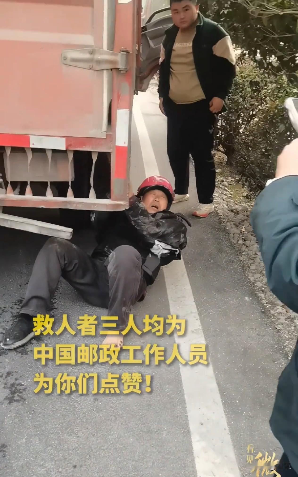 太危险了!货车底盘既然挂着一名老人在路上行驶! 近日,湖南邵阳一辆货车在路上正常行驶,底盘下方竟悬空挂着一位老人 老人身体随着车辆颠簸剧烈摇晃,四肢随时可能被底盘剐蹭,稍有不慎就会坠落,场面险象环生。 幸好被后方的邮政车辆及时发现,司机师傅和副驾驶同时大声呼喊停车,并且不停的鸣笛制止了行驶的大货车 通过路人的帮忙将老人抱了出来,及时拨打了急救电话,并且通知联系老人家属。 这事多亏了三位邮政的工作人员,让我们为他们点赞吧! 冬季行车要集中注意力,遇大货车务必远离盲区、保持安全距离,多一份警惕,就多一份平安!