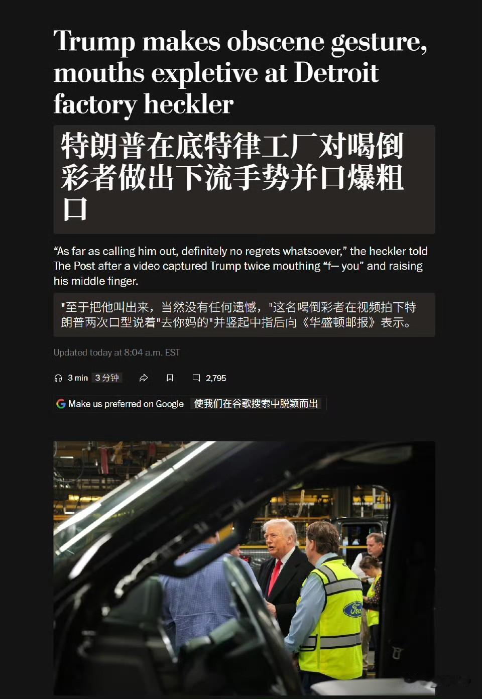 今天向特朗普大喊“炼铜保护者”的全美汽车工人联合会工人告诉华盛顿邮报,他已被停职,等待调查。这位 40 岁的工人表示:“至于当面叫出来这件事,我绝对没有任何遗憾。”目前给他筹款的众筹金额达到了$236,231。有美国网民表示:“如果这家伙被解雇——我就卖掉我的 Ford 。”