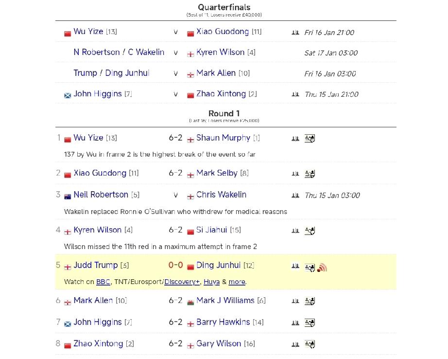 斯诺克大师赛8进4轮次赛程! 1月15日21:00 赵心童 vs 约翰·希金斯 1月16日3:00 马克·艾伦 vs 丁俊晖/贾德·特鲁姆普 1月16日21:00 吴宜泽 vs 肖国栋 1月17日3:00 凯伦·威尔逊 vs 尼尔·罗伯逊/克里斯·韦克林 8进4轮次,11局6胜赛制,四强7.5万英镑奖金。