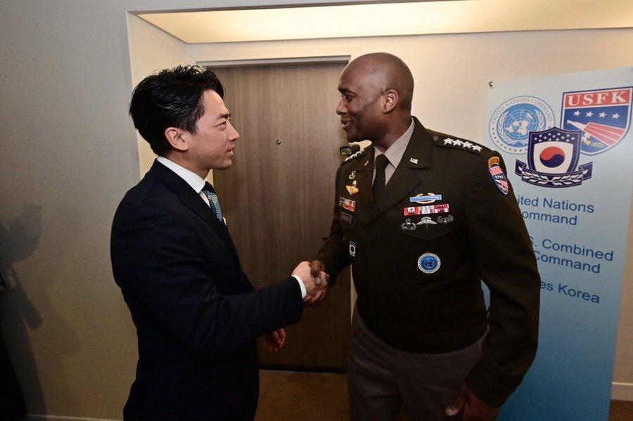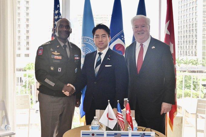 小泉进次郎:在夏威夷,我会见了驻韩美军司令布兰森将军。我们围绕地区事务进行了富有成效的讨论,包括日美韩三国合作的重要性。格拉斯大使和驻日美军司令约斯特将军也出席了会见。