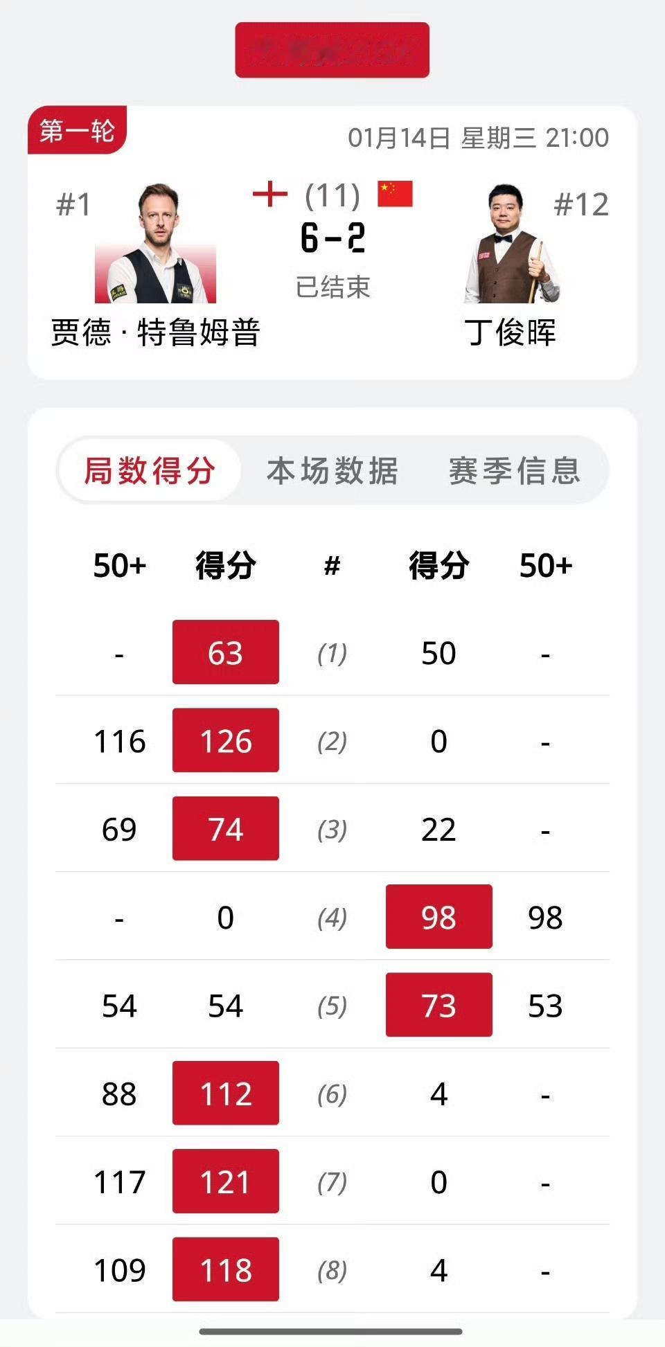 特鲁姆普赛后:3-0领先的时候,我就觉得不会以2-6输掉了……对阵小特,丁俊晖最近五连败场次。 2024世界公开赛决赛:4-10 2024冠中冠邀请赛:0-4 2025大师赛1/4决赛:3-6 2025英锦赛1/4决赛:2-6 2026大师赛首轮:2-6