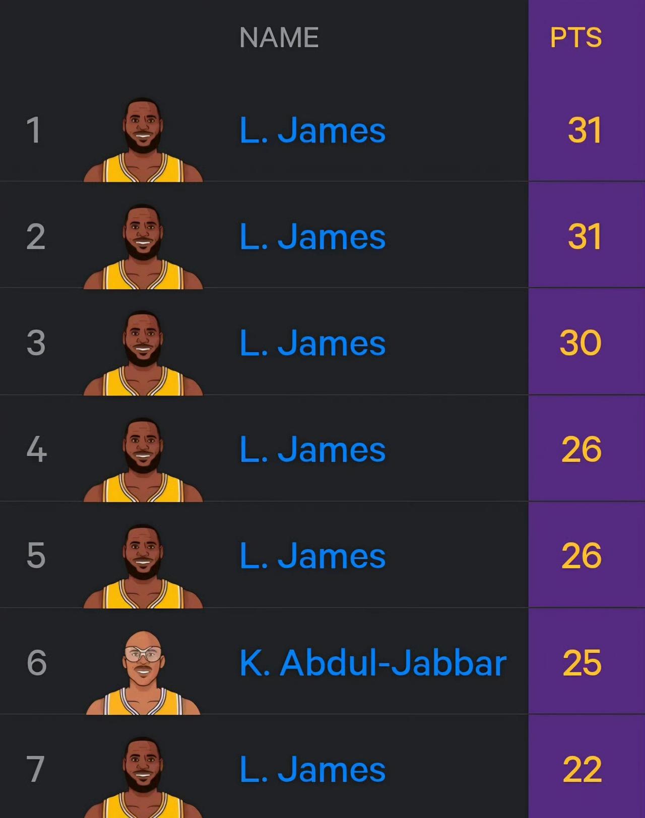 湖人本赛季一共得了4425分,丢了4426分。真正的“攻守兼备”…… 詹姆斯进入41岁之后,场均27.7分7.7板7.8助,投篮命中率55%。41岁球员单场得分榜都是他的纪录。