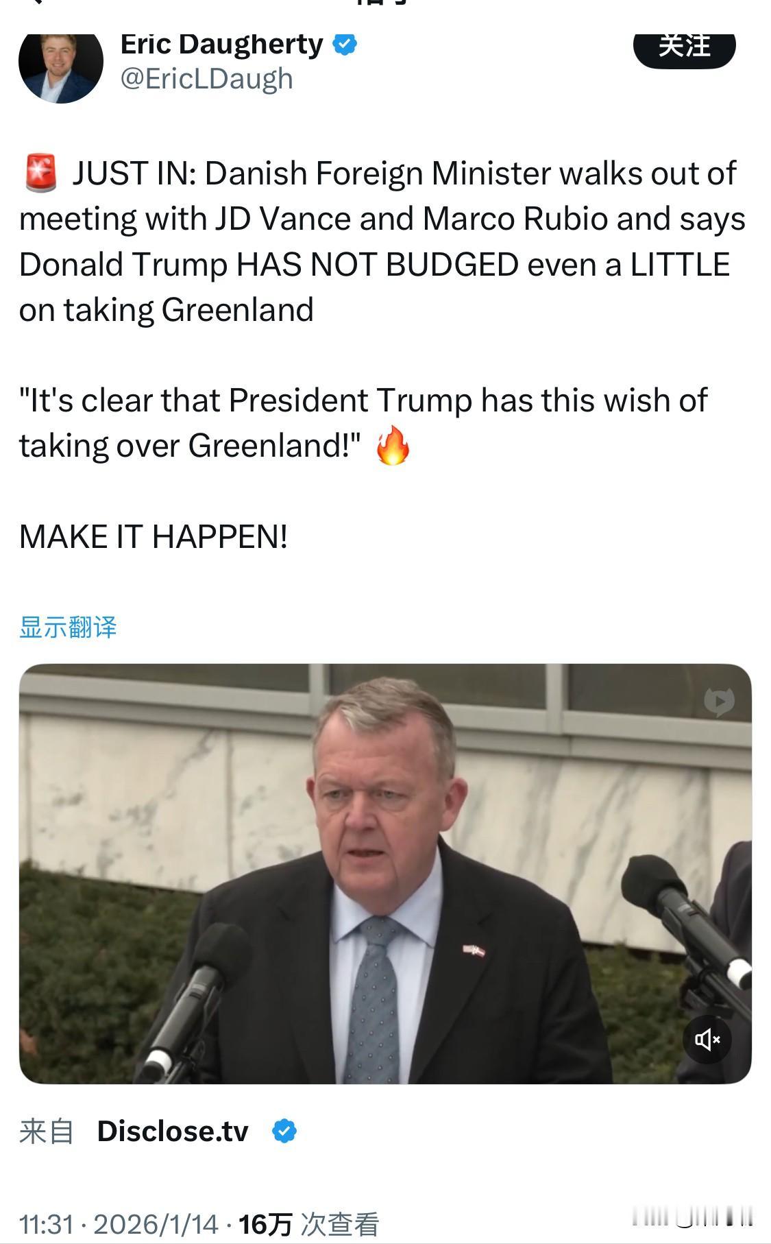 最新消息:丹麦外交大臣拉斯穆森(Lars Løkke Rasmussen)在和美国副总统约翰·万斯和国务卿马可·卢比奥会面后愤然离席,并表示唐纳德·特朗普在吞并格陵兰的问题上丝毫没有让步。 “很明显,特朗普总统想占领格陵兰岛!”
