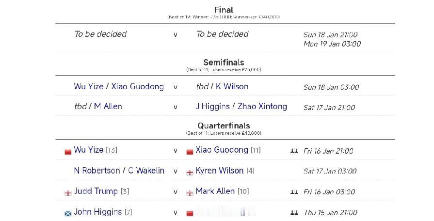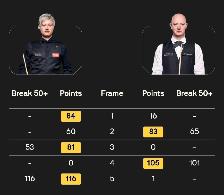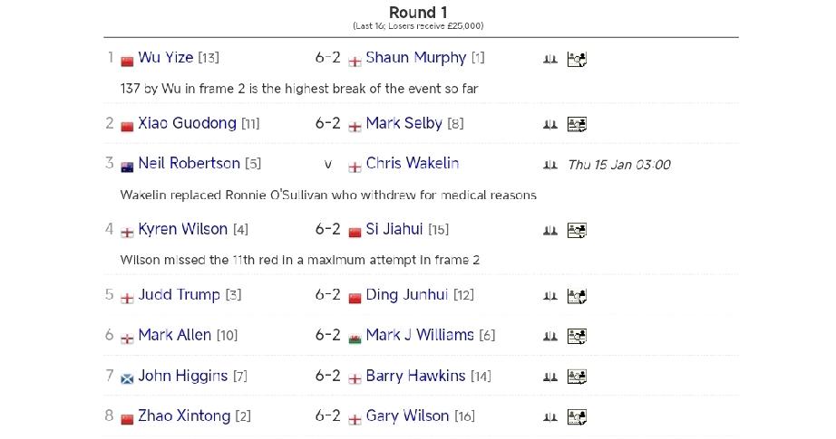 尼尔·罗伯逊 3-2 克里斯·韦克林 这是2026年斯诺克大师赛首轮最后一场比赛。前七场比赛比分都是6-2! 斯佳辉6-2肖恩·墨菲(三连鞭) 肖国栋6-2马克·塞尔比(四连鞭) 马克·艾伦6-2马克·威廉姆斯(五连鞭) 赵心童6-2加里·威尔逊(三连鞭) 约翰·希金斯6-2巴里·霍金斯(两个三连鞭) 威尔逊6-2斯佳辉(三连鞭、两杆破百) 特鲁姆普6-2丁俊晖(两个三连鞭、三杆破百) 最后一场16进8比赛,尼尔·罗伯逊 3-2克里斯·韦克林,最后结局还是6-2吗?