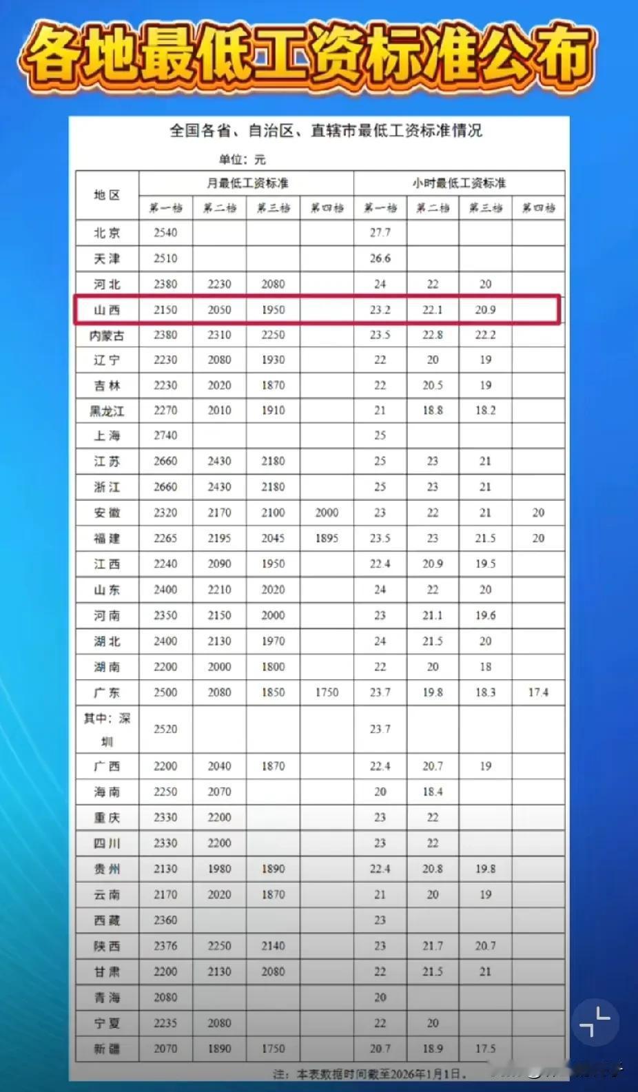 近日,人社部官网公布全国各省、自治区、直辖市最低工资标准情况。 核心数据速览(第一档,单位:元) - 月最低工资:上海2740最高;江苏、浙江2660并列第二;北京2540;天津2510;广东2500(深圳2520) - 小时最低工资:北京27.7最高;天津26.6;上海25 - 整体:26省第一档月标准≥2200元,16省≥2300元