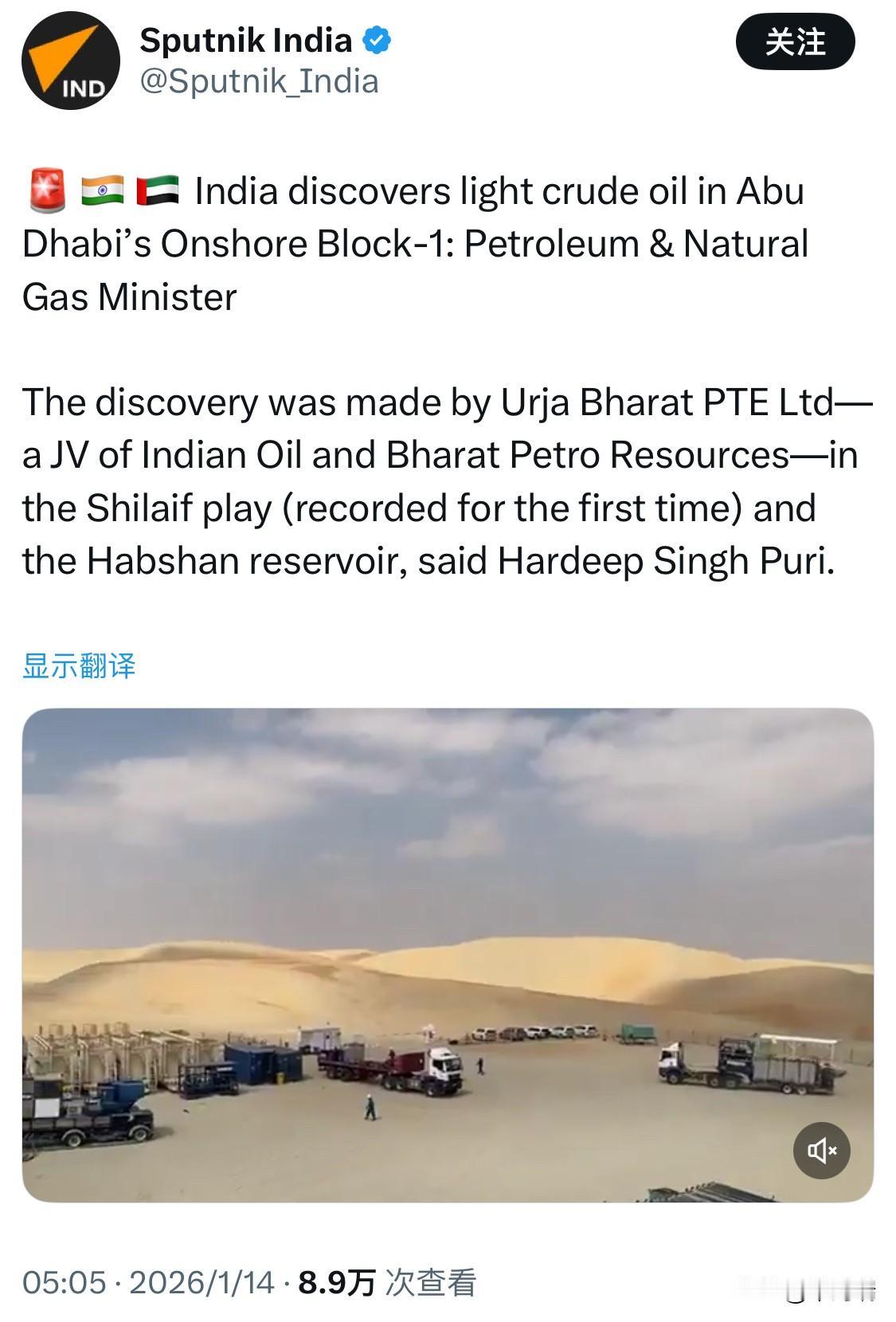 印度石油和天然气部长哈迪普·辛格·普里(Hardeep Singh Puri)于 2026年1月14日 发布的最新消息称,印度在阿布扎比陆上1号区块发现轻质原油。 据哈迪普·辛格·普里称,这一发现是由印度石油公司和巴拉特石油资源公司合资成立的 Urja Bharat PTE Ltd 在 Shilaif 油藏(首次记录)和 Habshan 油藏中取得的。 具体油藏: Shilaif 油藏:在 XN-76 勘探井中发现。这是该区块内首次记录到非常规(unconventional)Shilaif 油藏的发现,并通过水力压裂技术成功出油。 Habshan 油藏:在 XN-79 02S 勘探井中发现。这是该特许权区内首次在该地层发现原油。 投资与规模:该区块面积约 6,162 平方公里,UBPL 拥有 100% 的特许经营权。自 2019 年 3 月获得特许权以来,合资公司已在勘探阶段投入了约 1.66 亿美元。 战略意义:普里部长称这一发现是印度实现“能源自给自足”目标的新里程碑,有助于加强印度的海外上游能源资产布局,保障国家能源安全。 目前,该项目已完成勘探阶段,接下来将进入评估阶段(appraisal phase),以进一步确定这两个油井的商业可开发性和经济效益。