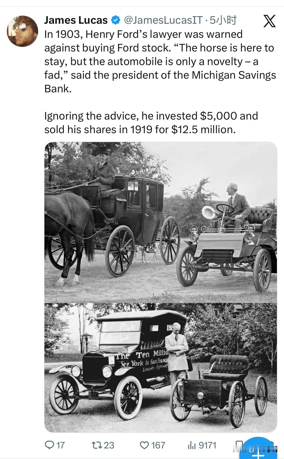 1903年,亨利·福特的律师被警告不要购买福特股票。“马匹会一直存在,但汽车只是