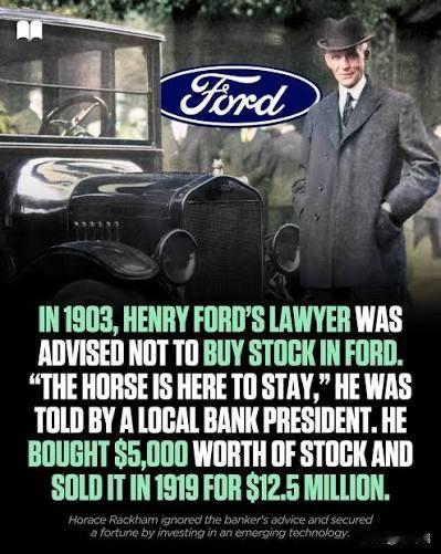 1903年,亨利·福特的律师被警告不要购买福特股票。“马匹会一直存在,但汽车只是一种新奇事物——一种时尚,”密歇根储蓄银行的行长说道。 他不听劝告,投资了 5000 美元,并在 1919 年以 1250 万美元(相当于今天的2.27亿美元)的价格卖掉了他的股票。 这是一个经典的商业历史案例,这位独具慧眼的律师名叫霍勒斯·拉克姆 (Horace Rackham) ,他是福特公司的注册律师。 以下是该事件的核心细节: 初始投资:1903年,拉克姆无视银行家的警告,向当时新成立的福特汽车公司投资了 5000美元(其中一部分是通过贷款筹集的)。 持有期间:他见证了福特 T 型车的成功以及汽车工业对世界的彻底改变。 退出收益:1919年,亨利·福特为了获得公司的绝对控制权,回购了所有外部股东的股份。拉克姆以 1250万美元 的价格卖出了他的股份。 回报率:在短短16年间,他的投资翻了约 2500倍。 拉克姆随后成为了著名的慈善家。他在去世后将大部分遗产捐赠给了密歇根大学,成立了拉克姆研究生院 (Horace H. Rackham School of Graduate Studies),该建筑至今仍是该校的标志性地标。这个故事常被用来警示人们:即使是金融专家,也可能完全误判颠覆性技术的未来。