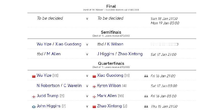 大师赛首轮中国国球员三胜二负! 波澜壮阔的2026年斯诺克大师赛首轮已经结束了七场比赛,比分全部锁定6-2!这将载入史册! 五名参赛中国球员取得了五胜二负的历史性成绩,值得高度肯定和赞扬! 吴宜泽击败未冕冠军肖恩·墨菲、肖国栋击败双圈大满贯马克·塞尔比、赵心童顺利战胜加里·威尔逊,晋级八强。 1/4决赛,吴宜泽对阵肖国栋,锁定一个四强席位!赵心童对阵约翰·希金斯。 吴宜泽、丁俊晖不敌世界前二凯伦威尔逊和贾德特鲁姆普,实力、状态都不如对手,输球也是在情理之中。 四强之中,中国能否占据两个席位? 今晚21点,赵心童出场,对阵约翰·希金斯,11局6胜赛制,赵公子加油! 明天3点,贾德·特鲁姆普对阵马克·艾伦。