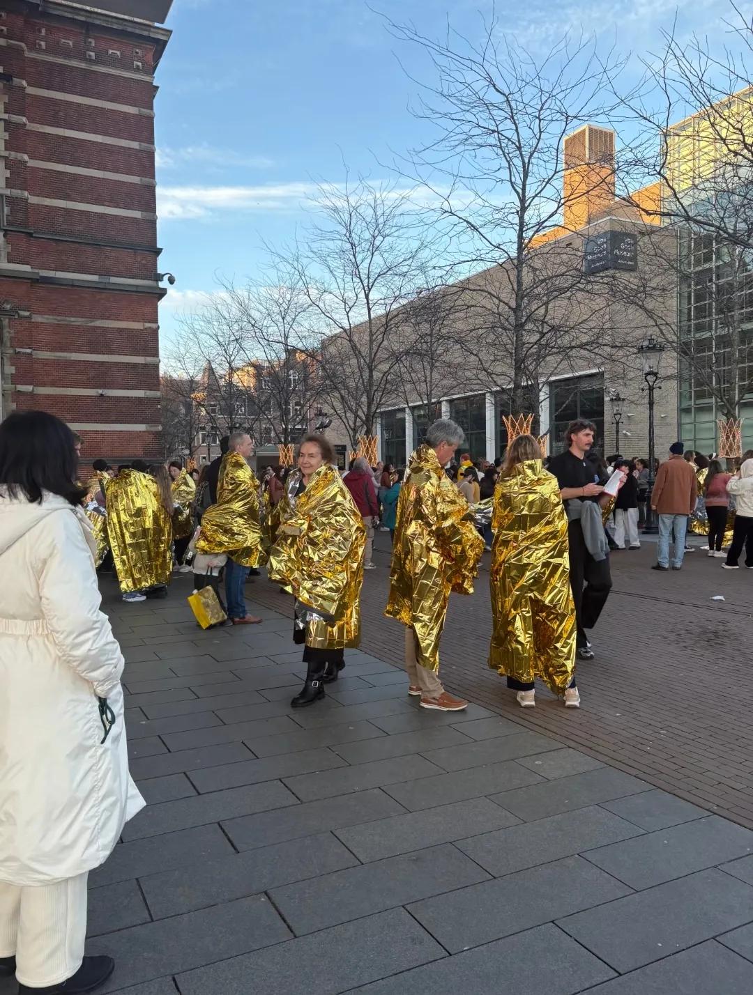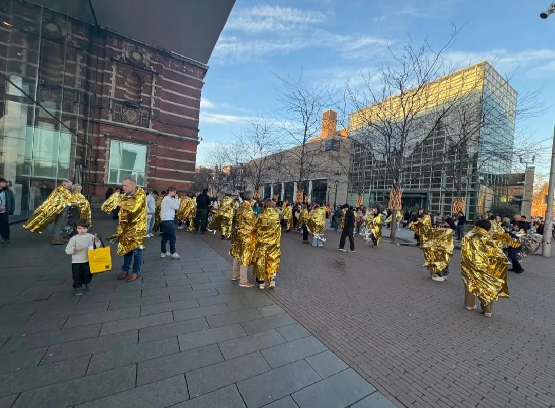 阿姆斯特丹梵高博物馆突遇全城断电,观众们裹着工作人员分发的金色保温锡纸离场。寒风中,这群锡纸人瑟瑟发抖的样子又好笑又特别,意外成就了博物馆外最动人的当代艺术。