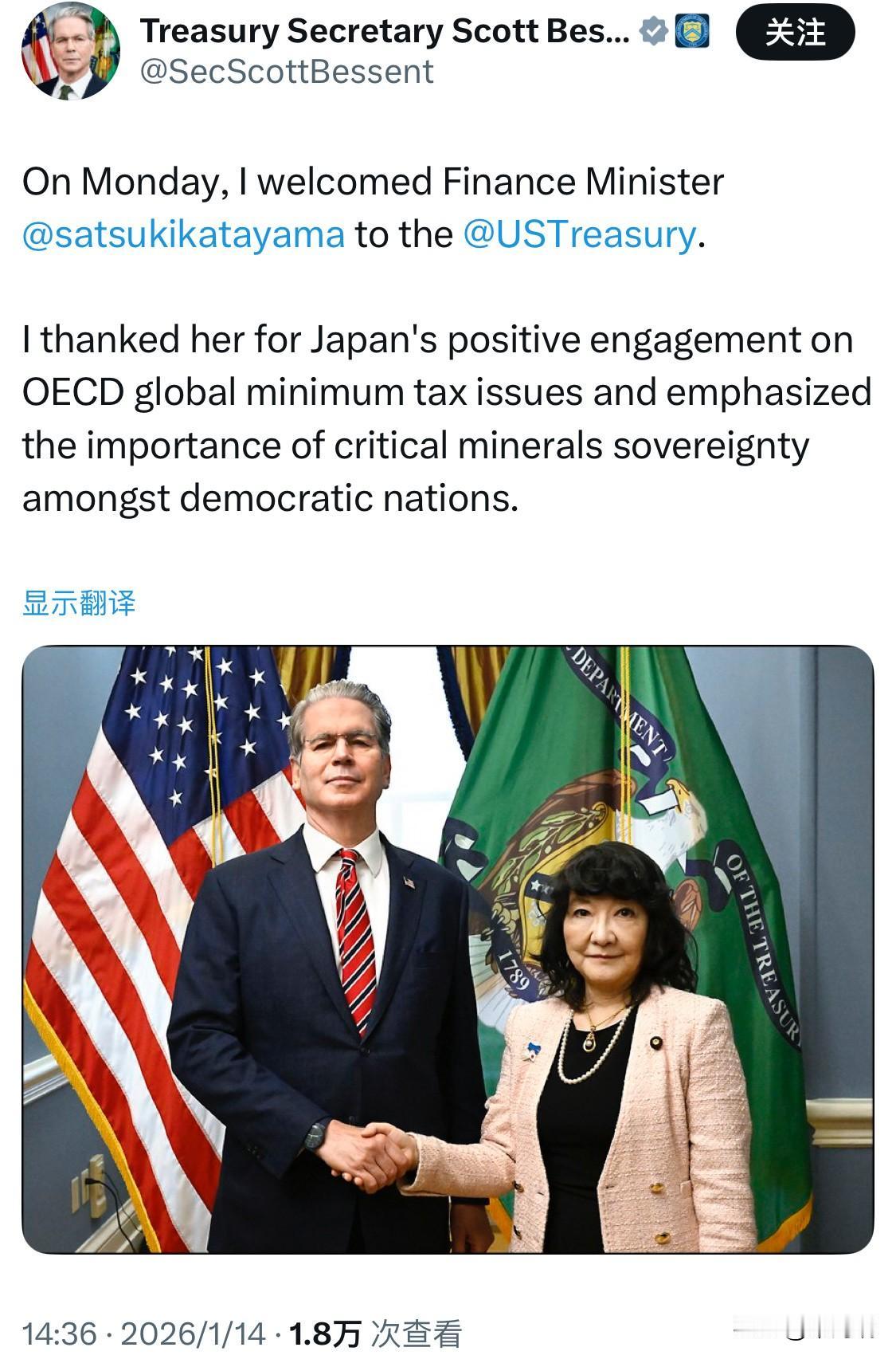 美国财政部长斯科特·贝森特(Scott Bessent)和日本财务大臣片山皋月(Satsuki Katayama)。他们于2026年1月12日在华盛顿特区举行了双边会晤。 会谈的重点包括: 外汇市场: 双方就日元单方面大幅贬值的走势交换了意见,片山大臣表示了“非常忧虑”,并称贝森特部长共享了这一观点。 合作: 双方确认日美财务官员将在外汇市场问题上继续保持密切合作与联络。 全球经济: 两位官员还就一系列全球经济问题和金融市场的发展交换了看法。 此次会晤是在G7(七国集团)财长会议期间举行的,旨在讨论关键矿产供应链的稳定供应等问题。