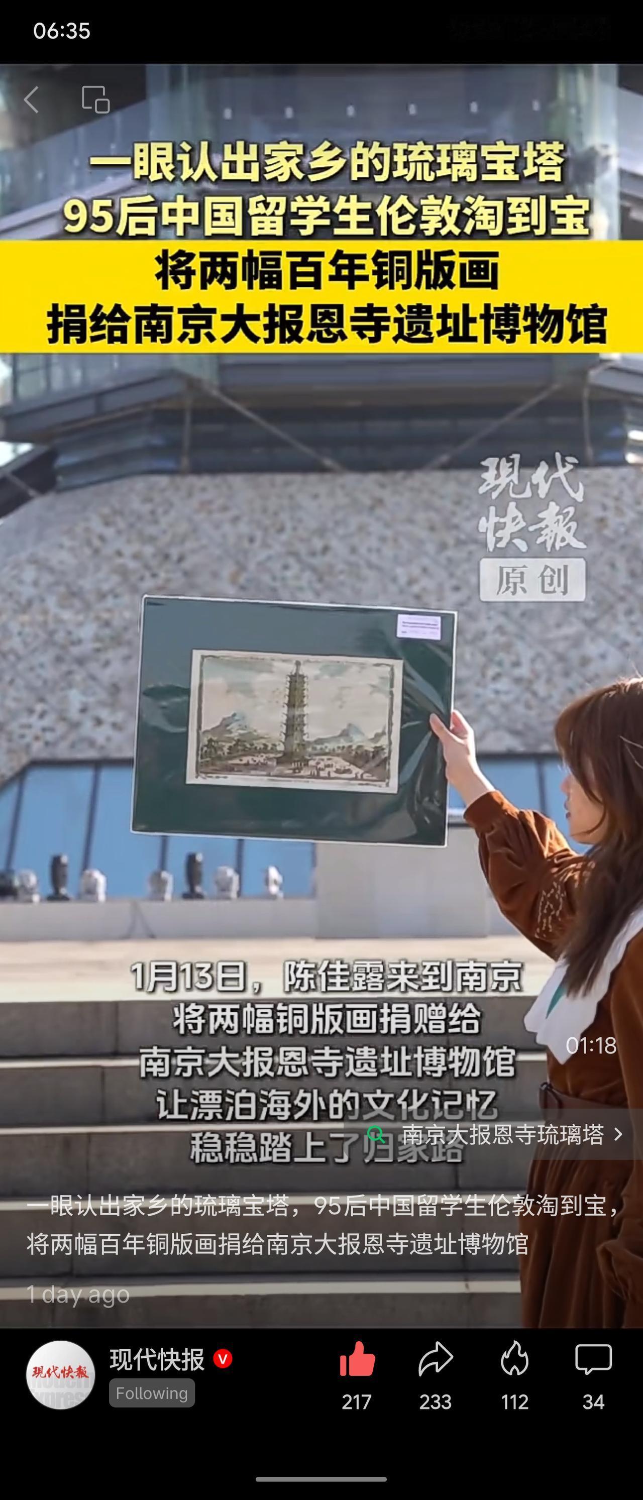 冬日生活打卡季95后中国留学生陈佳露在伦敦古董店发现两幅百年历史的大报恩寺琉璃塔铜版画,随后将其捐赠给南京大报恩寺遗址博物馆,让漂泊海外的文化记忆重归故土。