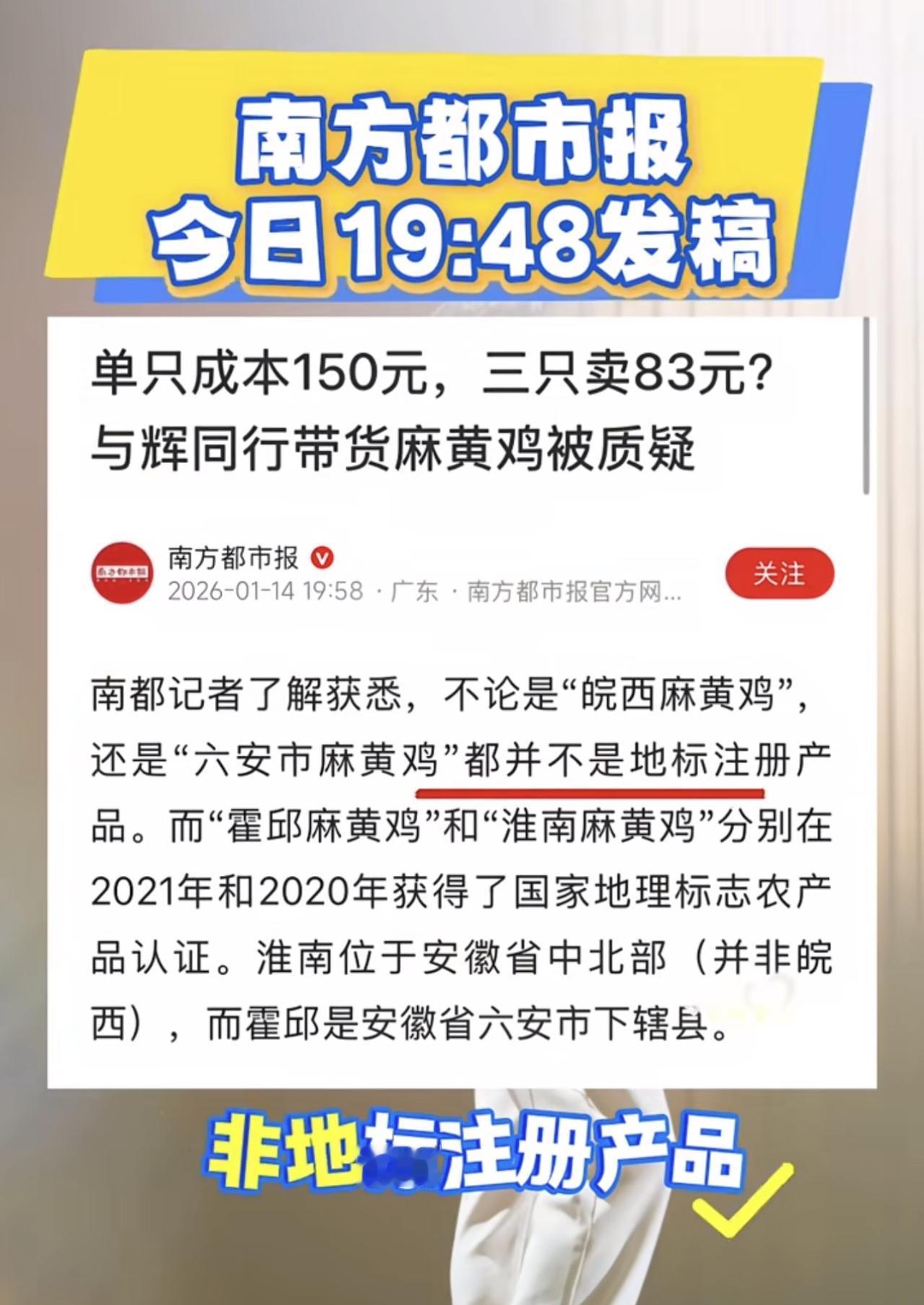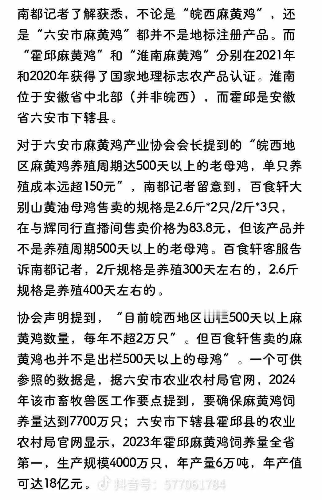 “鸡协会”的闹剧应该进入了尾声, 因为官媒和安徽官方数据证明了他们的言论就是无稽之谈。 《新黄河》和《南方都市报》的文章中列举的各种数据可以证明, 黄麻鸡协会发布的声明都是他们在自说自话。 所谓的500天黄麻鸡产量不到2万只, 他们的数据没有官方信息作依据, 而仅仅是协会会员自己统计的, 而官方数据是, 2024年该市就已经确保麻黄鸡饲养量达到7700万只, 所以那个两万只的产量的言论没有任何说服力。 至于他们质疑“百食轩”的麻黄鸡的真伪, 百食轩大别山黄油母鸡售卖的规格是 2.6斤*2只/2斤*3只, 在与辉同行直播间售卖价格为83.8元,但该产品并不是养殖周期500天以上的老母鸡。 2斤规格是养殖300天左右的, 2.6斤规格是养殖400天左右的。 这些数据就证明了, 与辉同行没有虚假宣传, 因为他们没有任何一个主播说这款鸡是饲养500天的, 既然如此, 又何来的虚假宣传? 麻黄鸡和黄油母鸡的鉴定区别是什么? 是肉质? 还是鸡毛颜色区分? 或者是鸡爪可以分别出来? 那个什么鸡会长他说人家的鸡不是麻黄鸡就不是? 规矩他定的? 协会会长能代表谁? 对于麻黄鸡的定义, 他自己都前后矛盾。 以前他发视频说麻黄鸡有两种, 一种是青爪, 一种是黄爪。 但是在发布所谓的声明前后, 他又说麻黄鸡只有青爪。 呵呵呵, 哪句话是假哪句话是真? 看来这导演不合格, 导演这部大戏之前不但没做好功课, 也忘记了叫陈会长自检一下自己账号里面的视频, 打自己脸的视频没有提前删除 , 才暴露出了鸡协会的谎话连篇。 据地方工作人员透露, “淮南麻黄鸡”并非现在行政区划下的淮南市麻黄鸡, 主要分布在淮南寿县、 六安霍邱、金安、裕安, 以及河南固始等地。 现在安徽六安市以及淮南市对麻黄鸡的命名都在抢注册。 上述六安农业农村局工作人员还称, 目前“皖西麻黄鸡”并没有注册地标产品, 反而是其他地市更早的进行了保种工作。 呵呵呵, 戏剧化的事情就这样发生了, 没有注册地标产品的, 喊话打假别人家的, 说到底, 争的就是“地标产品”的话语权, 所谓的协会, 其目的就是想要搞高价垄断。 鸡协会的视频删除了, 据说地方部门也对其鸡协会开始重视了…… 事情到了这里, 应该差不多都结束了。 “麻黄鸡”赢了, 现在全网皆知。 “鸡协会“也赢麻了, 这一波流量让这个默默无闻的陈会长出名了…… 然后呢? 剩下的满地鸡毛谁来收拾? 所有的骂名董宇辉默默承担…… 散会! 董宇辉