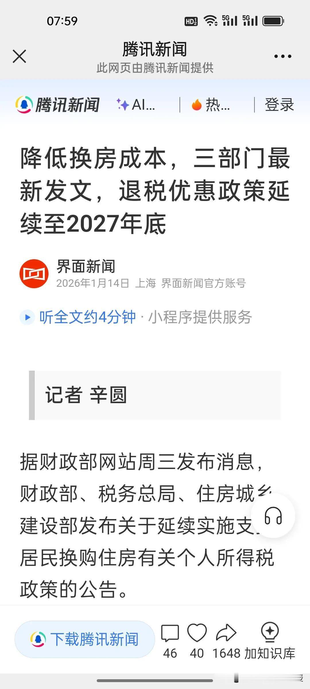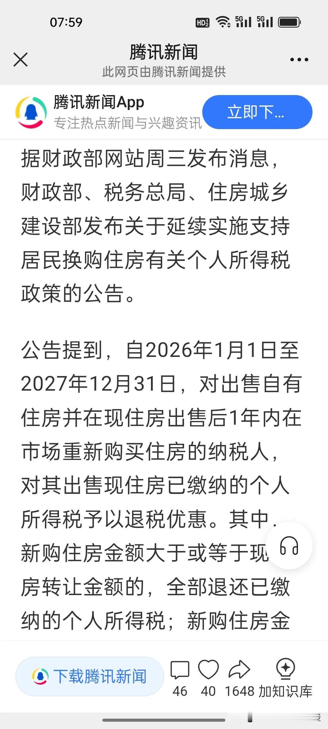 房地产又出大利好!换房退税政策直接续到2027年底,加上去年12月敲定的住房增值税新政,满2年卖房免增值税,直接帮购房者省下真金白银,两大税收红利形成组合拳,可以看出今年国家对于房地产的政策是继续降低交易成本,特别利好刚需购房者! 当前全国楼市二手房与新房房价持续低迷,房子去库存是最重要的问题,此次新政从交易成本端破局,既降低换房门槛,也盘活了置换链条。 2026年国家定调的“着力回稳房地产”的各种政策只会更密集,税费减免,房贷贴息等降成本措施还会持续落地,楼市回稳的政策支撑力满满,很多有潜在购房意向的人问当前房地产市场究竟是不是底部,现在从全国各地的数据来看,量价调整到位、政策红利集中释放,现在就是楼市筑底阶段里值得重点考量的时机。