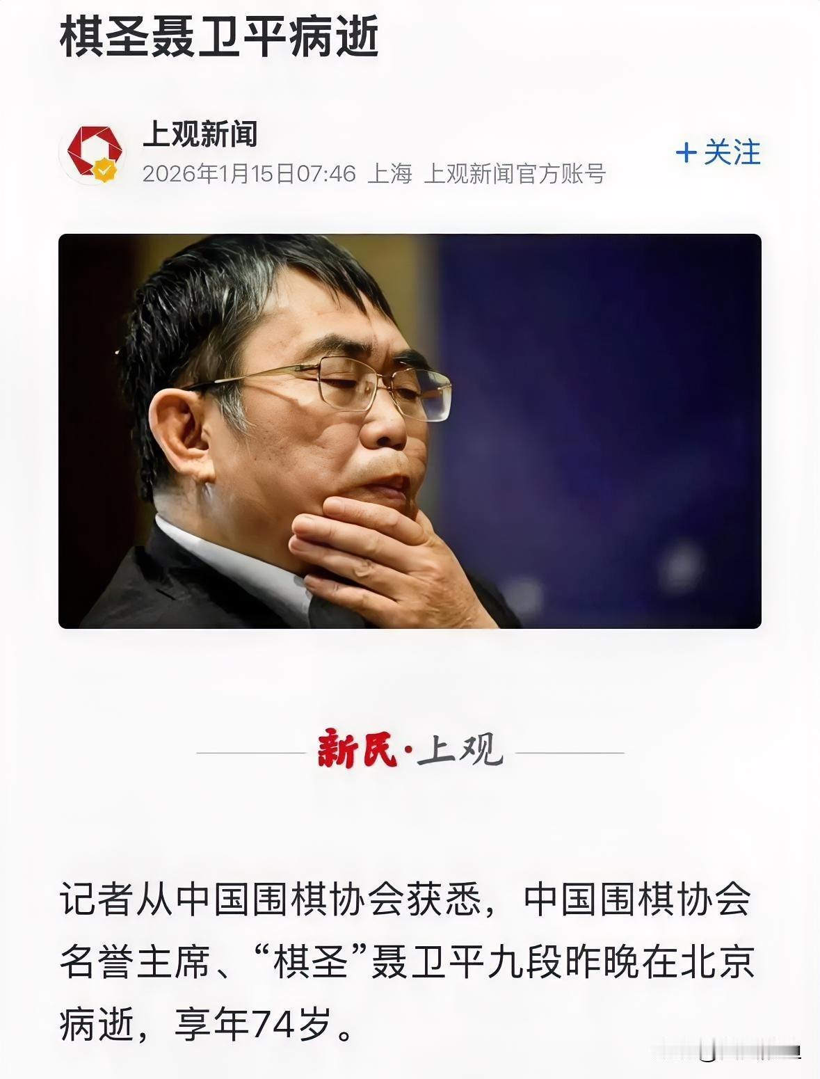 今早上刷手机,突然看到棋圣聂卫平老先生去世的消息,心里咯噔一下。太突然了! 我一下子就想起来好多年前,电视里看他下围棋,大战日本那些顶尖高手,像小林光一、加藤正夫他们。那会儿的中日围棋擂台赛,可真是牵动人心。老聂真猛啊,好几次在大家都觉得快不行了的时候,硬是顶住压力,一场场赢下来,最后把冠军捧回来了!那会儿大家是真激动,都喊他“棋圣”,为国争光,一点不假。 除了佩服他技术高,更服他脑子太活!我们普通人下棋,走一步看一步就不错了。聂老呢?人家是走一步,看三步五步,甚至更多。那脑子转的,布局深远得很,简直像把棋盘外的山河都装在心里了。 现在想想,这种智慧和魄力,真是独一份。聂老走了,感觉棋盘上都少了几分生气。怀念他,也怀念那个他叱咤风云、让人热血沸腾的年代。
