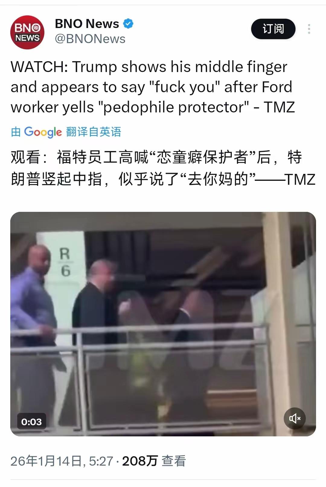 被特朗普竖中指的工人居然被汽车巨头停职了,瞬间让大家都明白了两件事: 第一件就是,这下大家都清楚了指责他是“恋童癖保护者”,是真的能激怒这位全世界最有权势的男人。 第二件事就是,老美根本就没有网上公知吹嘘的所谓言论自由。昨天一群吹嘘“看看什么叫言论自由”,结果今天啪啪打脸。只能说这群“意淫群体”不移民老美,天天赖在国内真是可惜了。 只要别吹嘘,别带入,老美新闻其实看着也挺好玩的。