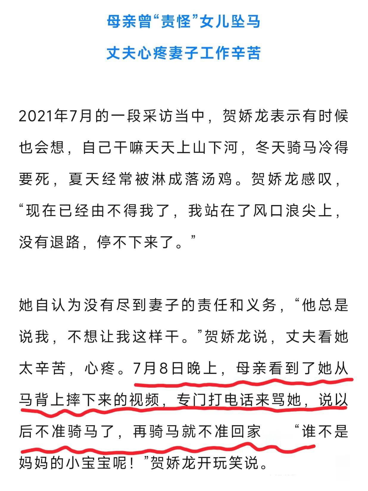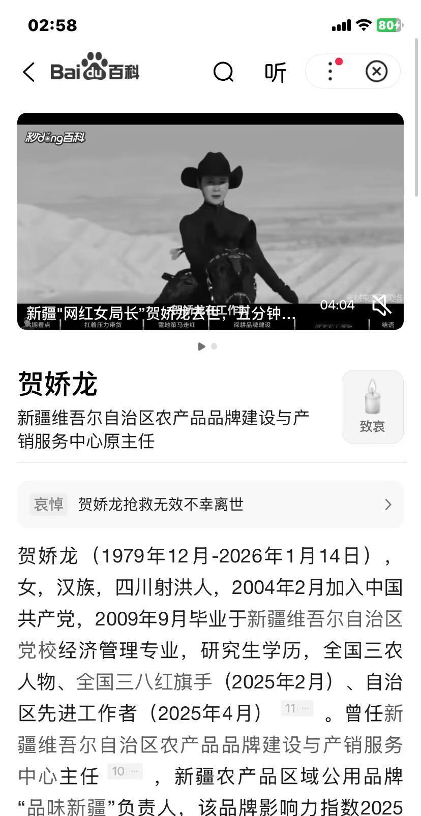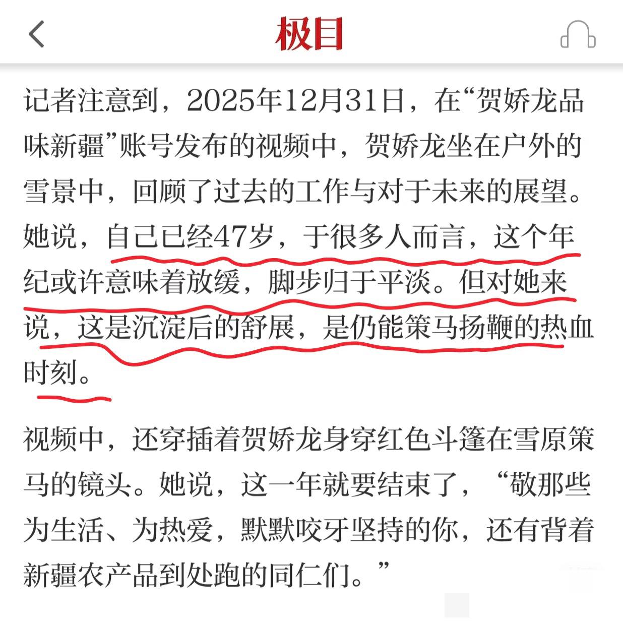 1月15日凌晨,新疆日报发布消息:2026年1月14日23时12分,贺娇龙因伤抢救无效,不幸离世,年仅47岁。 心痛💔很多人祈祷了一天,最终还是没能等来好消息……。 一名基层女干部就这样走了,生命戛然而止。 关键之前她已经坠马不止一次,每一次都极有危险‼️因为骑马还被母亲责骂过,没想到最后还是因为骑马。 据说也是因为她骑马才红的,带动了当地产品宣传,可是冬天骑马本就有很多危险,为了形象宣传她似乎已经是“骑马难下”了,致敬、致哀!