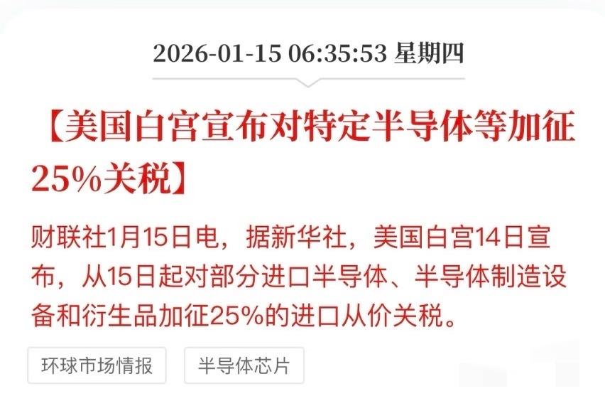 突发!美国对特定半导体加征25%关税,这一政策已于1月15日生效。从产业角度看,虽短期内可能扰动市场情绪,但长期却是国内半导体产业发展的契机。