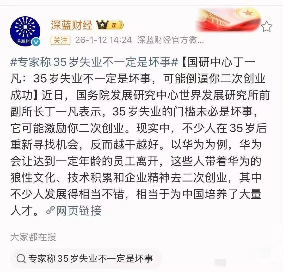 科学家丁凡:35岁失业不一定是坏事。 我就是这样35岁被裁员了打工没地方要了才被逼着自己创业了。有时候困境确实像道逼门令,把人从惯性里推出来,反而能撞见新可能。当然,不是每个人都能如此,但换个角度看,失业或许也是重新审视自己的机会。
