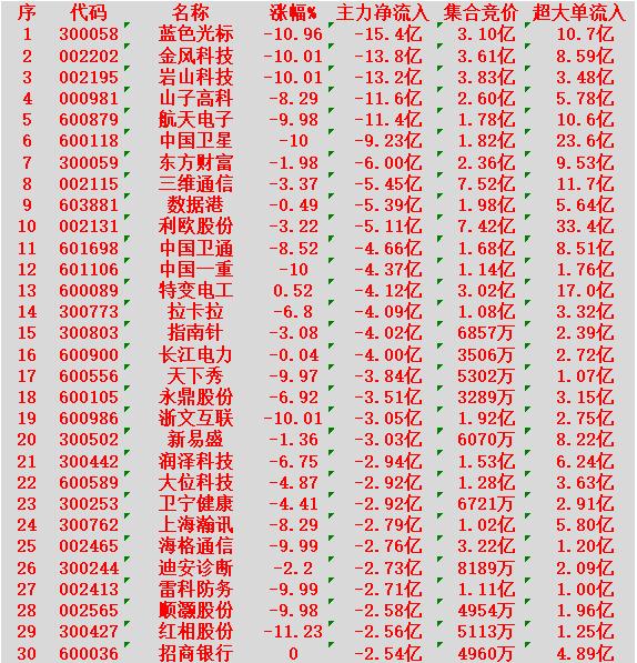 1月15日开盘45分钟,主力资金“卖出的 ”30名单! 蓝色光标:净流出 15.4亿元 金风科技:净流出 13.8亿元 岩山科技:净流出 13.2亿元 山子高科:净流出 11.6亿元 航天电子:净流出 11.4亿元