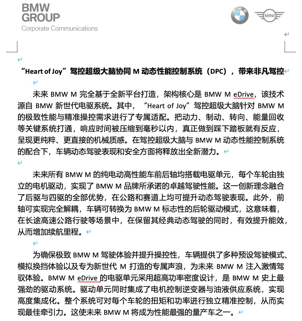 宝马这套“Heart of Joy”驾控超级大脑你可以把它理解将动力、制动、转向、能量回收等系统都集中在一个小盒子里管控着。 那这种管控的终极形态就是四个电机独立控制每个车轮了,新时代的BMW M的纯电动高性能车就是这么干的。 至于搭载“Heart of Joy”宝马纯电动车嘛,我们刚试完,解密后再跟大家讲讲。