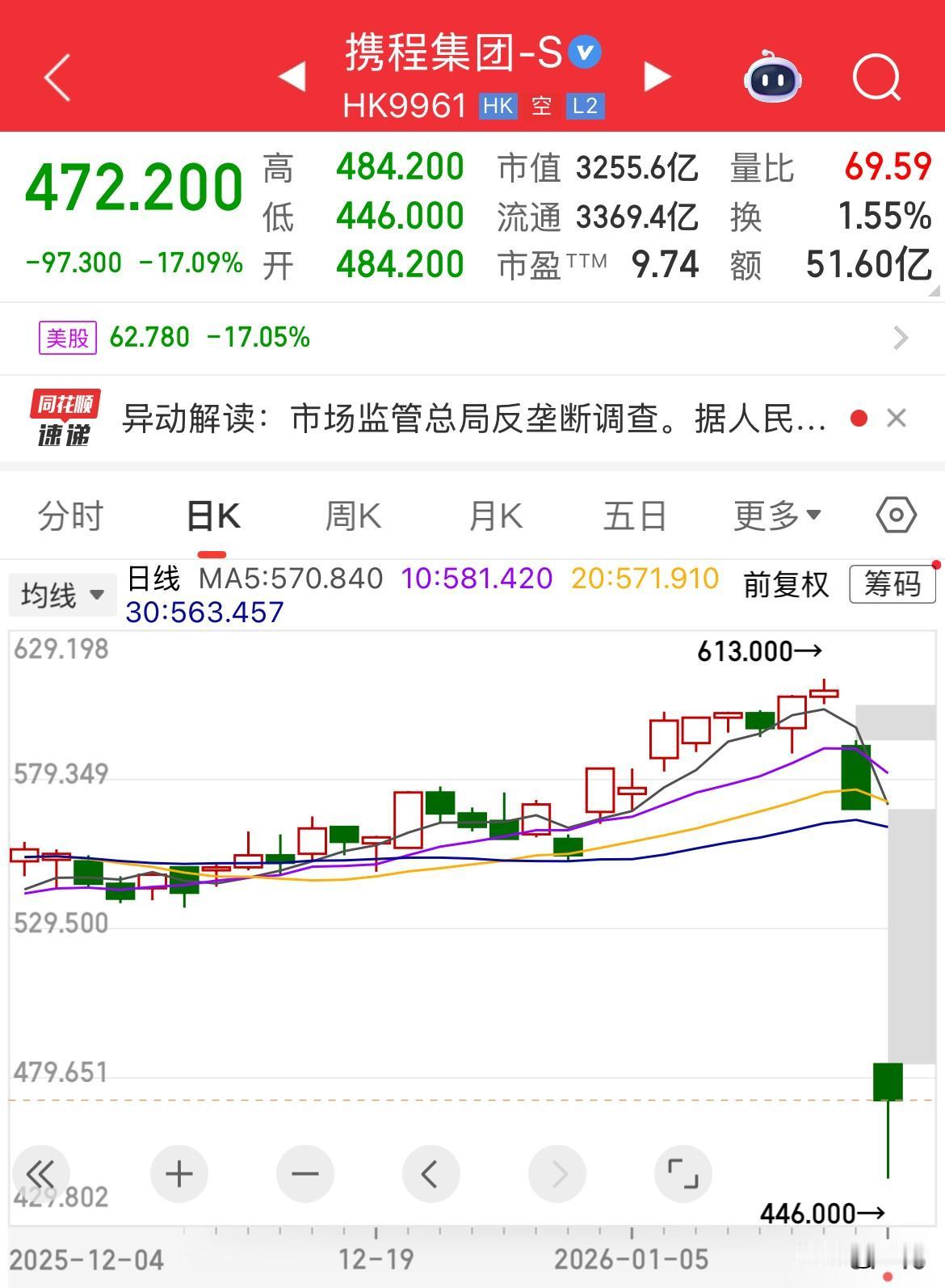 携程H股开盘跌21.69%,现跌17%,目前市值3266亿,加上昨天下跌7%,市值一夜之间蒸发了800亿元。 按照阿里巴巴当年的反垄断调查的处罚结果,携程+同程旅行的垄断行为预计还面临着天价处罚。