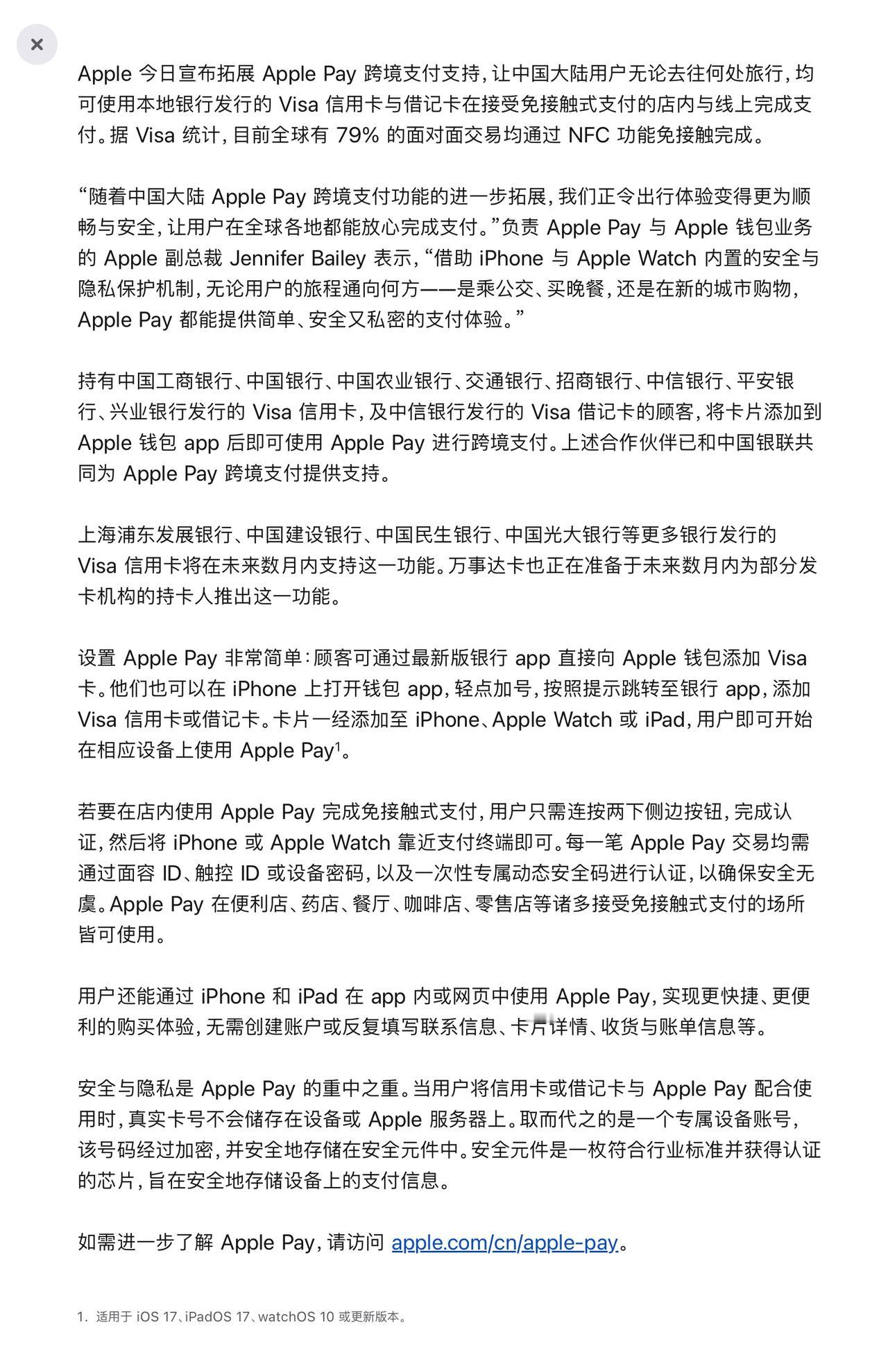 苹果中国宣布拓展 Apple Pay 的跨境支付,支持在 Apple Pay 中绑定本地发行的 VISA 卡,包括 VISA 信用卡和借记卡 方便苹果用户跨境支付了