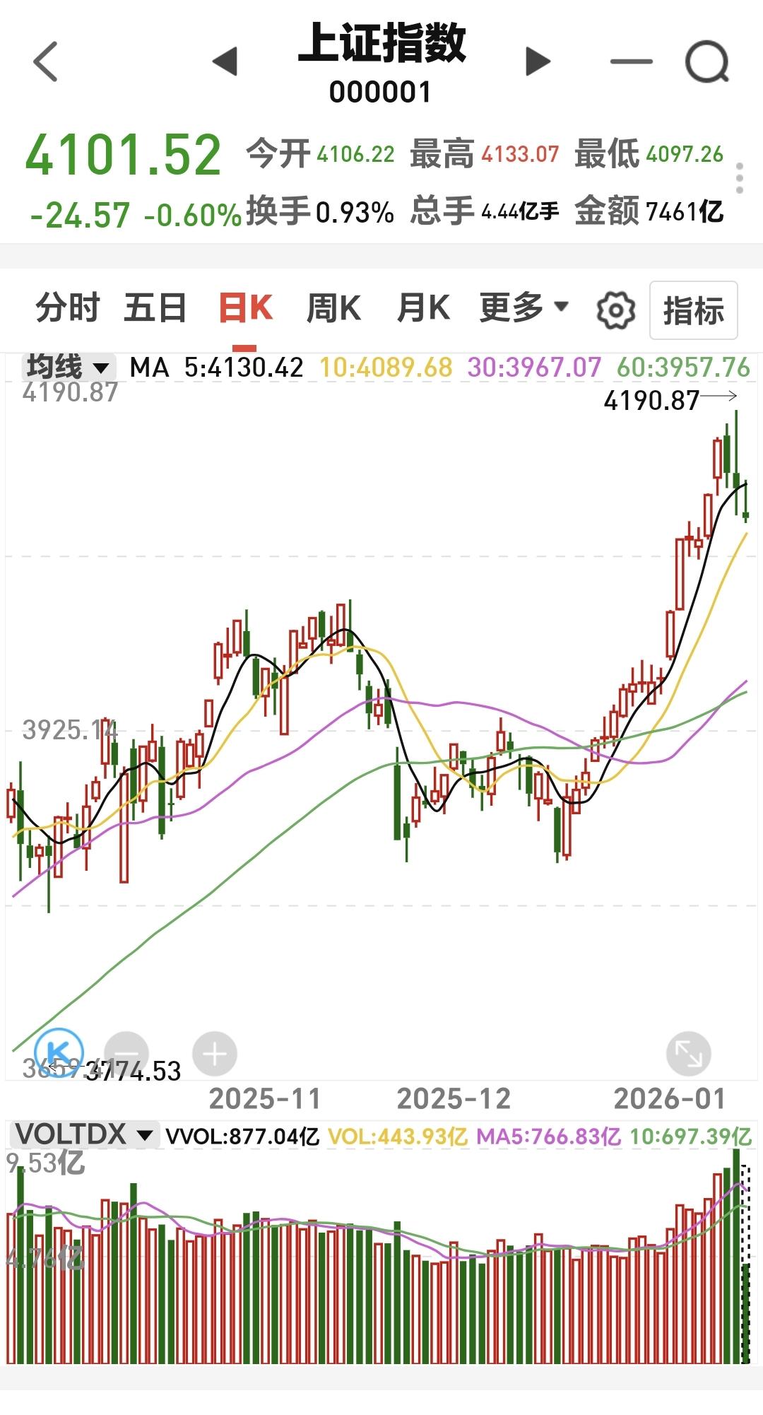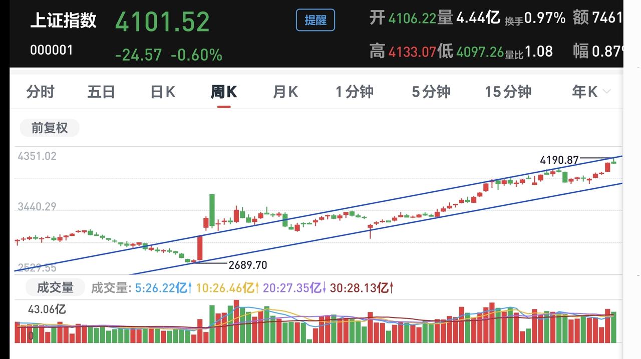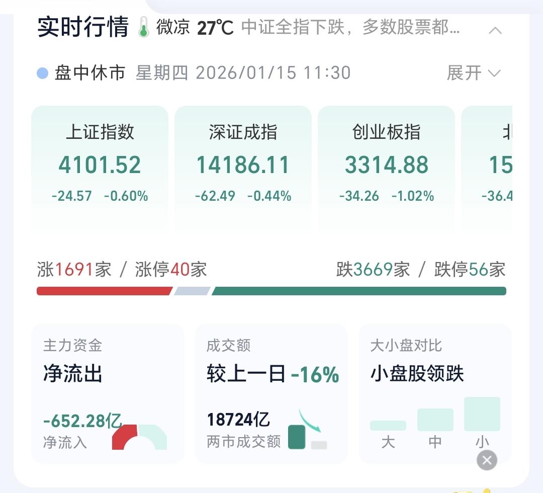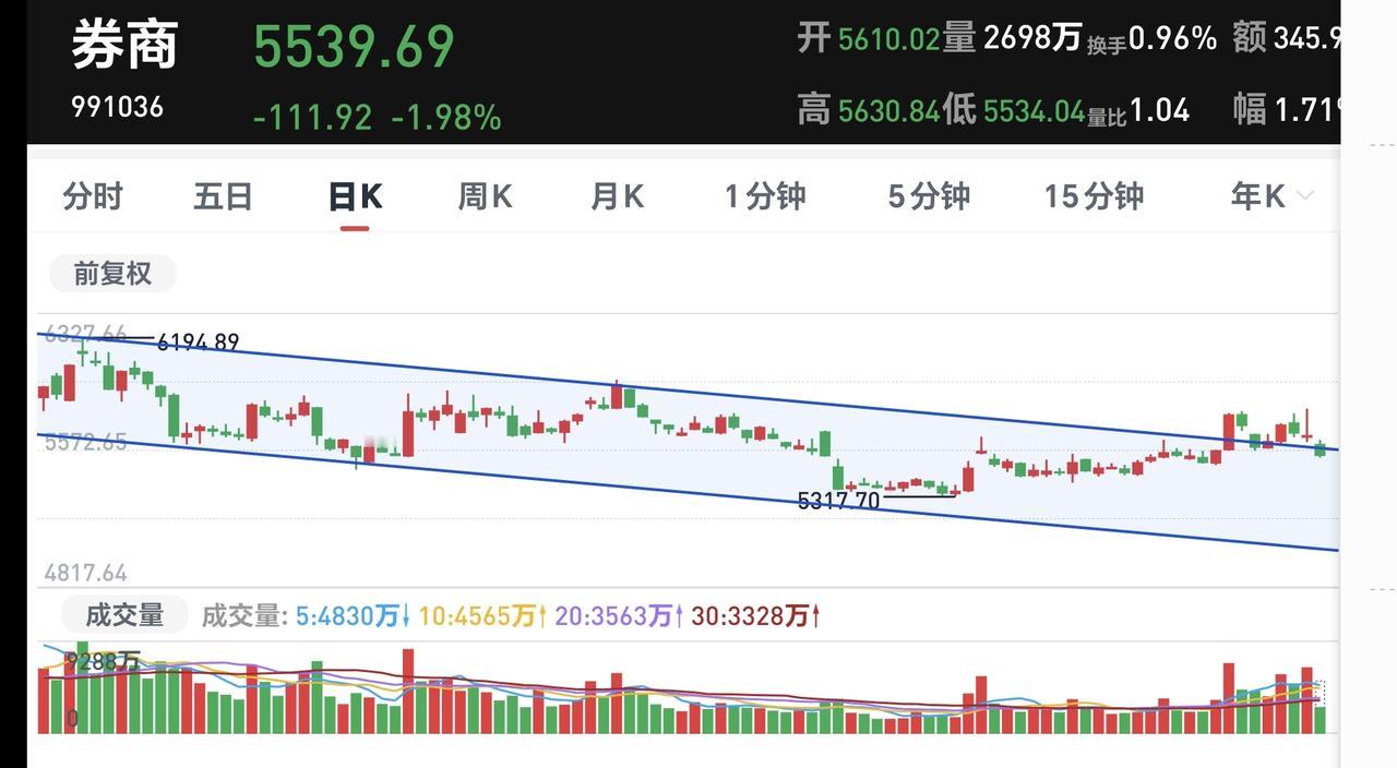 基金:今天是倒车接人,还是下跌的开始 今天上午市场低开以后冲高回落,中午收盘的时候,三大指数都是下跌,创业板指下跌了1.02%,收于3314点,上证指数下跌了0.60%,收于4101点。 整个股票市场,上涨1691家,下跌3669家,涨停40家,跌停56家,上涨家数少于下跌家数,跌停家数多于涨停家数。 持有的基金中,中午收盘的时候,估值上涨的只有新能源汽车板块,估值下跌幅度最大的三个板块是:AI应用板块,可控核聚变板块,证券板块,估值整体亏损了9857元。 整个基金市场,上涨8838家,下跌9971家,没有上涨幅度超过5%的基础,下跌幅度超过5%的25家。 图9是今天基金的上涨排行榜,图10是今天基金的下跌排行榜,图11是ETF上涨幅度排行榜,图12是今天基金的加仓榜,图13是今天基金的减仓榜。 1:今天上午黄色线在蓝色线下方,两条线之间的敞口不是很大,这样就给下午带来了想象的空间,观察下午黄色线会不会上穿蓝色线,如果黄色线能够上穿蓝色线,市场翻红还是有可能的。 2:今天上午两市累计成交18724亿,相比于昨天缩量了16%,正常情况下,今天下午的缩量幅度会继续放大,因为昨天下午的成交量是非常大的。 3:中午收盘的时候,五天线位置是4130点中午的收盘点位4101点,收在五天线之下,下午继续观察能不能重新站上五天线,能不能收盘的时候收在五天线之上。 4:我们来看一下下面的截图14,这是主力资金进出板块的情况,主力资金净流入最多的三个板块是:有色金属板块,电池板块,大宗商品板块,主力资金净流出最多的三个板块是:人工智能板块,国企板块,机器人板块。 5:有一个板块与大盘的走势息息相关,这个板块是调控大盘走势的工具,这个板块就是券商板块,我们来看一下券商板块的情况。 我们来看一下下面的截图15,这是券商板块日K线图,从图中可以看出,我画了两条倾斜向下的斜线,这是券商板块日线级别下跌通道,前几天上涨突破了这个下跌通道的上轨,但今天的下跌又回到了这个下跌通道内,也就是说,券商板块日线级别重新回到了下跌趋势中。 我们来看一下下面的截图16,这是券商板块周K线图,从图中可以看出,我画了两条倾斜向上的斜线,这是券商板块周线级别上涨通道,现在的位置处于这个上涨通道内,但距离这个上涨通道的下轨比较近,近期观察会不会下跌跌破这个上涨通道的下轨,如果跌破这个上涨通道的下轨,券商板块周线级别上涨趋势也有可能被改变。 如果券商板块周线级别上涨通道被跌破,预示着券商板块周线级别的走坏,这就有可能带动我们的市场进行持续的调整。 6:我们来看一下下面的截图17,这是上证指数周K线图,从图中可以看出,我画了两条倾斜向上的斜线,这是上证指数周线级别上涨通道,本周最高上涨到这个上涨通道上轨线上,然后是回落到现在,也就是说,这个上涨通道的上轨线是有压力的,近期观察是继续回落,还是再次冲击这个上涨通道的上轨线。 7:我们来看一下下面的截图18,这是创业板指周K线图,从图中可以看出,我画了两条倾斜向上的斜线,这是创业板指周线级别上涨通道,本周上涨曾经突破了这个上涨通道的上轨,但现在又回到了上涨通道内,创业板指周线级别上涨通道的上轨也是有压力的。 很多人关心,今天是倒车接人,还是下跌的开始,我认为,今天既不是倒车接人,也不是下跌的开始,因为今天的调整最低点,不会是整个调整的最低点,另外,后面虽然还会有下跌,但前高将来还是要被再次突破。 今天下午还是观察三个方面:会不会跌破五天线,会不会缩量20%以上,跌停家数会不会超过30家,如果三个条件全部符合,基本上确定昨天的盘中最高点就是近期的小高点,这个高点将来还是会被突破,这个高点并不是大级别的高点,这个高点更不是2026年的最高点。 我每天都会分享我的观点,我的观点只代表我个人的看法,不能作为你操作的依据,据此操作后果自负。