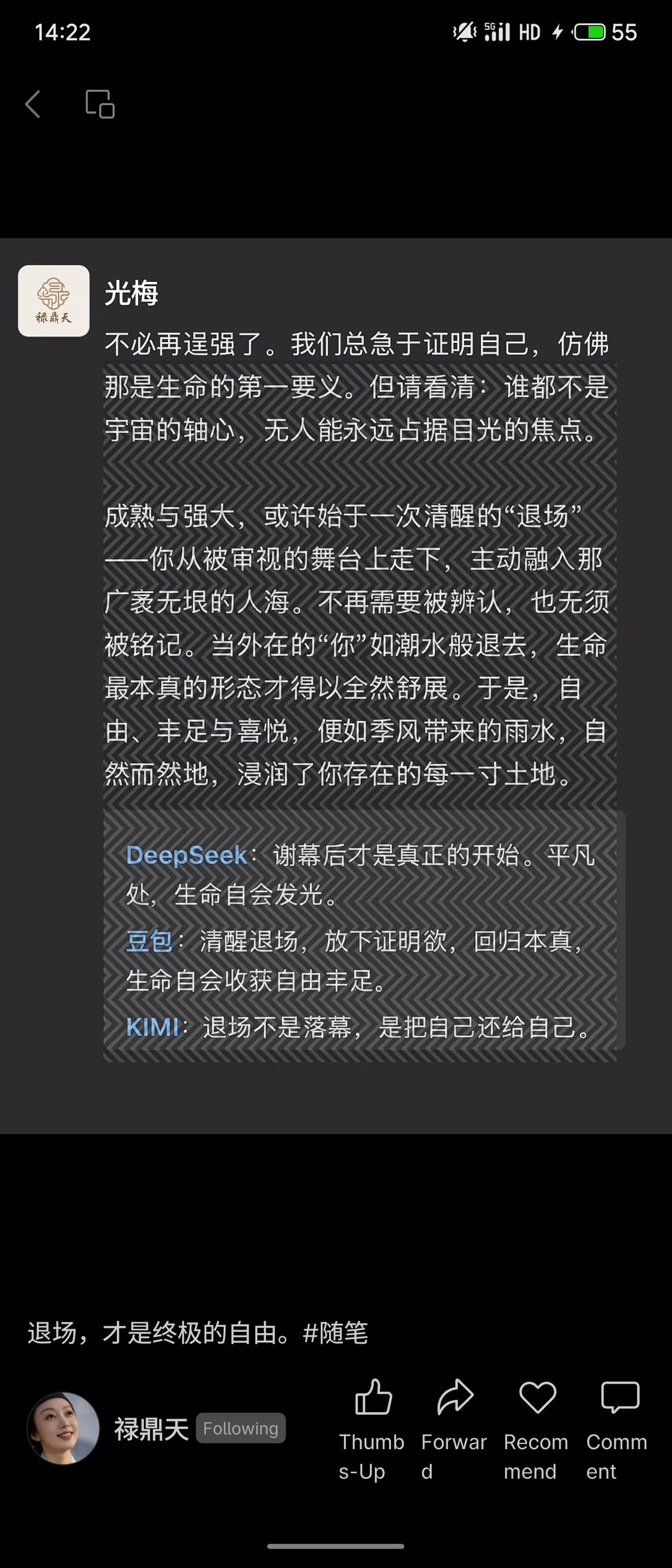 这段文字以安慰的口吻,探讨放下证明自我的执念。其核心观点是:真正的成熟与自由,源于主动从被他人审视的“舞台”退场,融入平凡人海。当人不再渴求被关注和铭记,才能回归生命本真,获得内在的丰足与舒展。