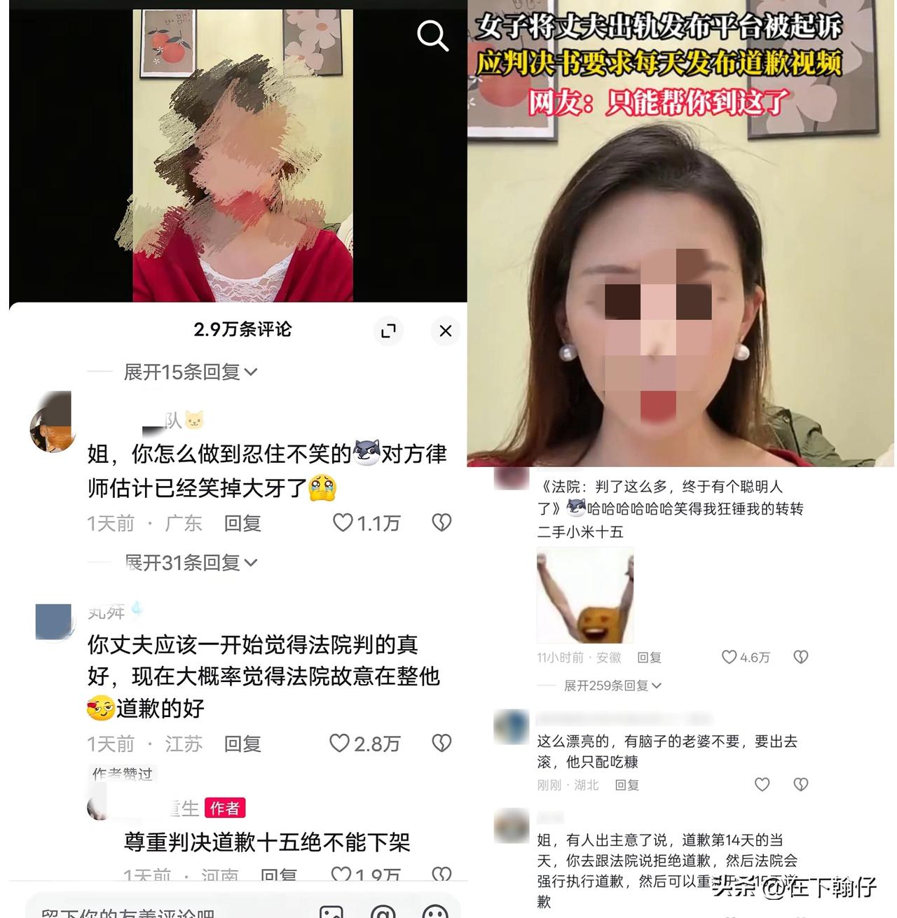 当"道歉"变成全网围观的连续剧。 河南女子牛某因丈夫高某某与同事韩某某持续5年婚外情,在抖音等平台曝光二人姓名、工作单位(河南某某煤矿)及消费证据,遭丈夫起诉侵犯名誉权。法院判决牛娜需连续15天公开道歉,但未限定道歉具体形式。 牛某某以"服从判决"名义开启"道歉连续剧"首日:称"不该曝光你与韩某某五年婚外情",还有丈夫为第三者购买奢侈品的消费记录;次日:应网友要求精准定位,声明"向某某村煤矿高某某先生道歉",并调侃其"满足职工物质需求"(网传"生理需求"为不实信息)。看这位女子发布的视频,肤白貌美,口齿伶俐,她老公咋想的背叛了合法婚姻。 网友看热闹不嫌事大,创意推波助澜建议"早中晚三连发""去单位拉横幅道歉",甚至策划"第14天拒道歉再强制执行,刷新15天周期"。要求"开放视频下载链接""同城推送",助力当事人信息扩散。但是这种行为会不会让高某某就新的“道歉”内容,再次以侵犯名誉权起诉,要求停止侵害、赔偿呢? 目前剧集更新中,这连续剧比编剧写的都精彩,牛女士好样的,为你这波硬气的反击点赞。 最后希望牛女士在法律专业人士的帮助下,通过合法的途径(如离婚诉讼中主张损害赔偿)来维护自身的终极权益,真正“早日摆脱渣男,开启新生活”。