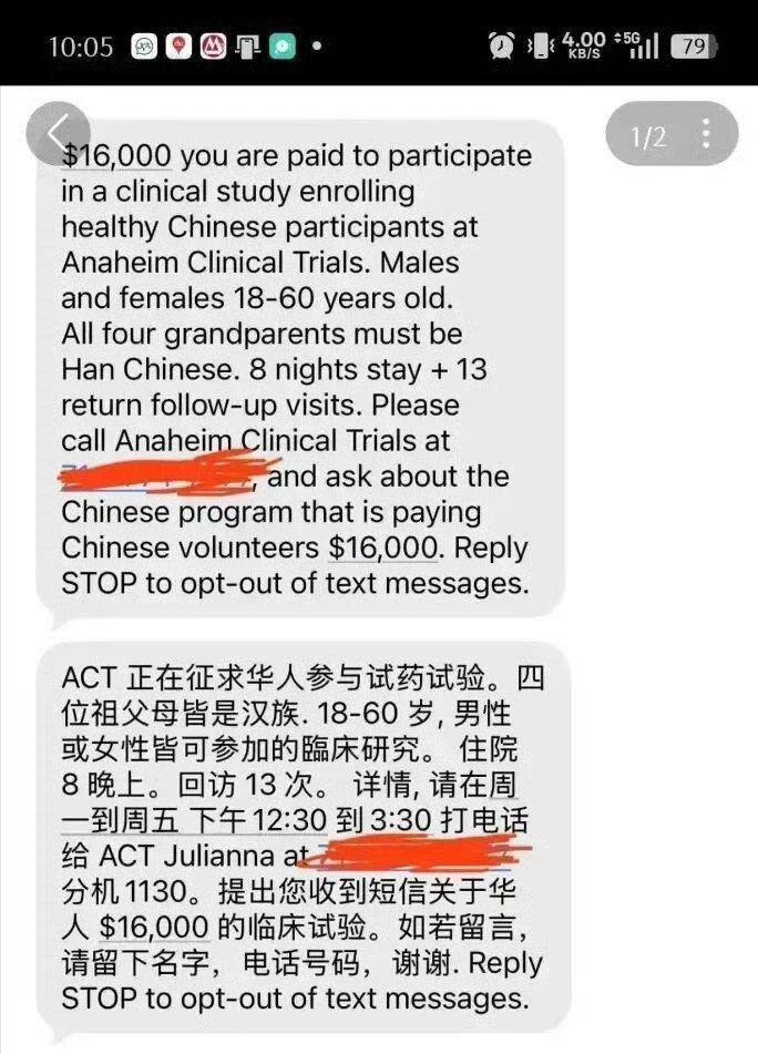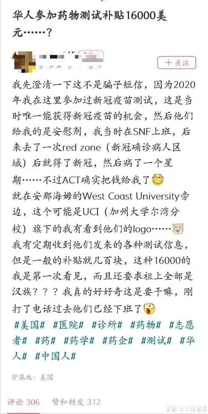 警惕,警惕,这个必须警惕。 有网友称,美国的医药巨头,正在募集华人志愿者,进行药物试验。 说是志愿者,但是爆料者称,会给提供1.6万美元的资金补助。 1.6万,还是美元,这可不是一笔小数目。也不知道,炸家医药公司进行的是什么药品的试验?为什么要特意制定是华人呢? 再结合美国计划退出世卫组织,此事就更蹊跷了。