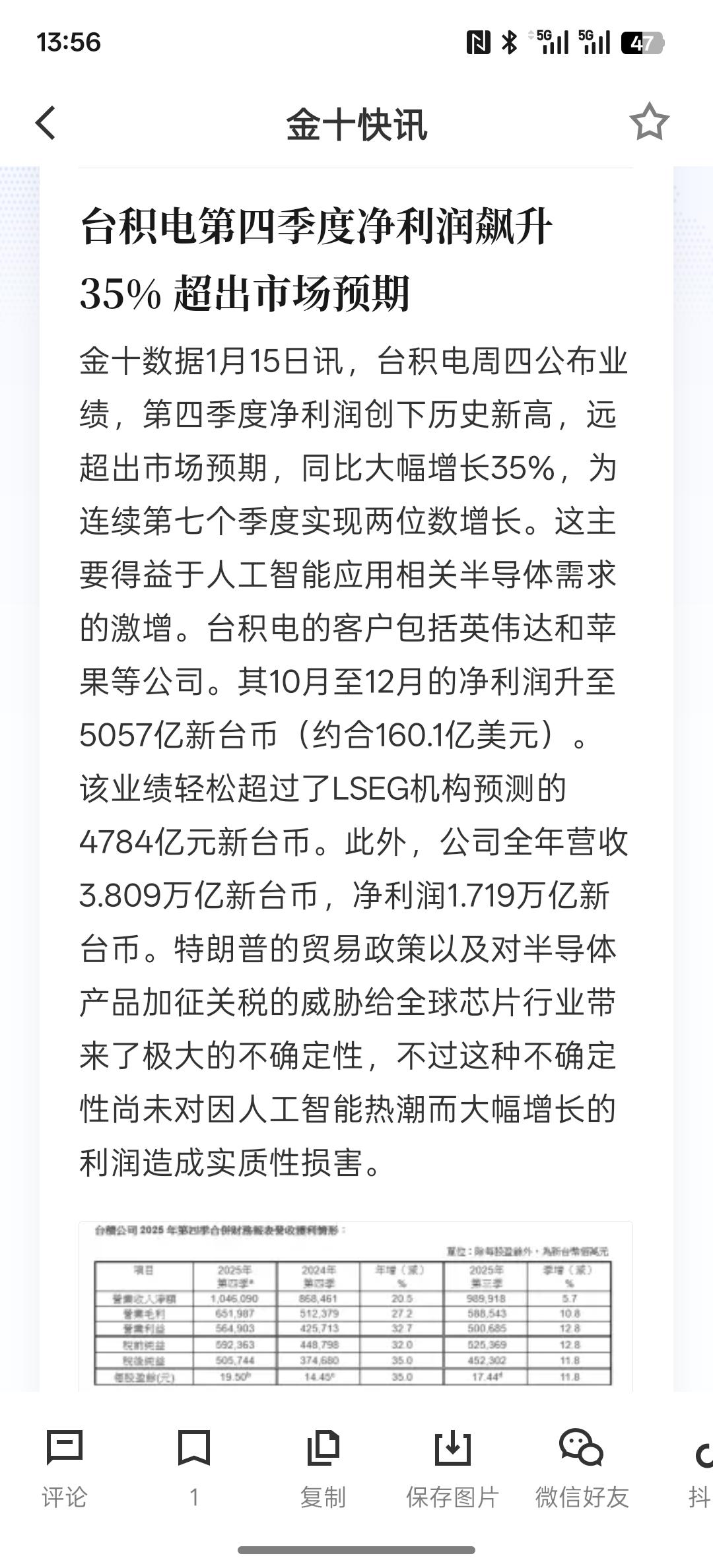 利好消息,台积电第四季度净利润飙升35% 超出市场预期,这确实超出了市场预期,没想到台积电的利润增长那么高!看来去年对芯片加工产业确实,利润大幅增长。根据去年三星公布的财报。三星的利润增长的更快,它的利润增长到200%以上!三星目前要大规模的进行芯片产业链的工厂开阔投产!那根据机构预测,今年2026年存储芯片依然有上涨的价格,而且还有最大的需求量,至少要延续到2027年左右,所以很多企业也在对芯片半导体产业链继续加码投资!