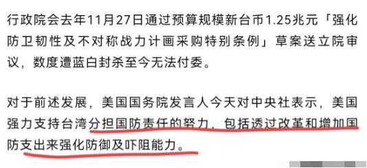 美国又改口了!在特朗普表示,“中方认为台湾是中国一部分,怎么处理是中方自己的事”之后,美国又出来表态了!1月15日,根据岛内媒体报道,美国国务院发言人表示,美国强力支持台湾分担“国防”责任的努力,包括通过改革和增加“国防”支出来强化防御及威慑能力。我们欢迎赖清德宣布台湾计划在今年将国防支出占GDP比重提高至3%以上,并在2030年提高到GDP的5%。 美国在台湾问题上“说一套做一套”早已不是新鲜事,但这次短短时间内的态度反转,还是让人看清了其“以台制华”的真实算盘。 就看这个所谓的“国防支出提升计划”有多离谱。根据岛内公布的2026年度总预算案,防务相关支出高达9495亿新台币,约占GDP的3.32%,这是自2009年以来首次突破3%的关口,而到2030年要涨到5%的目标,更是让岛内舆论一片哗然。 要知道5%的防务支出占比,通常只有战争状态下的国家才会出现。对比一下台湾的民生支出就能发现问题:2025年台湾的社会福利支出是8310亿新台币,教育科学文化支出6050亿,而明年的防务预算直接远超这两项关键民生开支,赖清德当局宁可削减民生福利,也要讨好美国买武器,这种“重武轻民”的做法,说白了就是在“掏空台湾”。 美国之所以这么积极推动台湾增加防务开支,核心目的就是让台湾当“提款机”和“桥头堡”。 一方面,台湾增加防务预算,最大的受益者就是美国军工复合体。近年来美国对台军售不断升级,2025年底特朗普政府刚签署的2026财年国防授权法案,就预留了最高10亿美元支持“台湾安全合作倡议”,还宣布了价值逾111亿美元的对台军售,台湾花的每一分“国防”经费,最终都变成了美国军火商的利润。 另一方面,美国想让台湾“自掏腰包”强化所谓“防御能力”,本质上是推行“以台制华”的战略,让台湾自己承担对抗大陆的成本,美国则坐收渔翁之利。 就像专家分析的,美国国会在涉台问题上长期扮演极端角色,台湾的游说团体渗透国会,使得很多议员只考虑美国国内政治和经济利益,根本不管台海局势的稳定。 更值得警惕的是,美国对台政策正在不断突破红线。早在2025年2月,特朗普政府上台还不满一个月,就删除了美国国务院网站上“不支持台独”的表述,虽然美方辩称只是“更新事实说明书”,但明眼人都能看出这是在虚化、掏空“一个中国政策”。 而这次支持台湾提升防务支出,更是与中美三个联合公报的精神背道而驰。根据1982年的《八·一七公报》,美国明确承诺不寻求长期向台湾出售武器,准备逐步减少并最终解决售台武器问题,但现在美国不仅没有减少售台武器,反而变本加厉推动台湾增加军费,这种背信弃义的行为,严重破坏了台海和平稳定的基础。 对于台湾来说,跟着美国搞“倚美谋独”根本没有出路,反而会让自己陷入绝境。其一,增加防务支出会让台湾经济雪上加霜,国民党议员游淑慧就质疑,要达到5%的GDP占比,防务预算需要从4674亿新台币增加到1兆2500亿,额外的8000亿要么砍社会福利,要么加税举债,最终负担都会落到台湾民众身上。 其二,这种“以武拒统”的做法只会加剧台海紧张局势,让台湾面临更大的安全风险。现在连日本企业都开始用脚投票,2024年日企对台投资暴跌27%,多家大企业撤资,就是因为担心台海局势升级。 其三,美国从来不会真正“保护”台湾,华盛顿智库早就发布报告示警各方准备“撤侨计划”,这已经很清楚地说明,台湾在美军眼里只是可以随时抛弃的“棋子”。 其实美国在台湾问题上的算盘并不复杂,就是想通过“两面下注”渔利:一方面对中国大陆说些缓和的话,试图换取谈判筹码;另一方面又不断武装台湾,掏空台湾的经济和战略资源。 特朗普政府上台后对台积电的操作就是最好的例子,通过补贴和技术卡脖子等手段,逼迫台积电向美国转移产能,把台湾最重要的产业攥在自己手里,等榨干台湾的价值后,再把台湾当成筹码与中国大陆讨价还价。这种“卖台”操作,比单纯的“挺台”更具危害性。 说到底,世界上只有一个中国,台湾是中国的一部分,这是国际社会的普遍共识,也是中美三个联合公报确立的基本原则。 美国这种前后矛盾的表态和操作,改变不了这一基本事实,也阻挡不了中国统一的历史大势。赖清德当局一味“倚美谋独”,不断增加防务开支,不仅会让台湾民众的生活水平下降,还会把台湾推向战争的边缘,最终只会落得“竹篮打水一场空”的下场。 台海和平稳定符合两岸同胞的共同利益,任何分裂国家的行径,都必将遭到历史的审判。