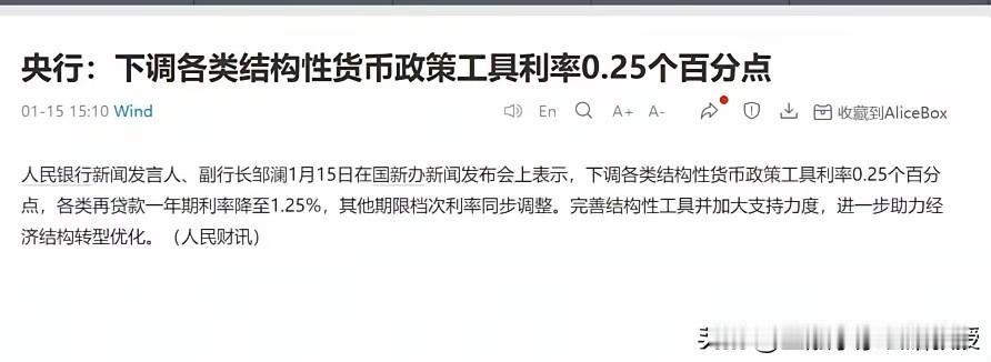 央行降息0.25个点!这类行业直接迎红利!房地产行业也将间接受益! 刚刚,央行官宣下调各类结构性货币政策工具利率0.25个百分点,一年期再贷款利率降至1.25%!这波操作直接降低了实体企业的融资成本,小微企业、制造业成最大赢家。 对于A股来说,昨天中午交易所提高融资保证金,市场控制了一下“慢牛”的节奏,今天商业航天和AI领域歇火,大批量相关个股跌停,唯有芯片概念回归视野,很多人在猜,会不会年前大盘见顶了,但是盘后马上来利好消息了!这对明天A股有极大的提振,大盘有望在10日线附近企稳。 行业方面来看,制造业中的高端装备、新能源赛道,以及聚焦中小微企业服务的金融科技公司,还有绿色能源板块的龙头,大概率会迎来资金关注。毕竟低成本资金能让企业低成本经营,还能扩产、研发更有底气,业绩预期更加可观。 央行刚刚说了,今年降准还有空间,这一波波政策红利砸向A股,选对赛道才能踩准股市节奏!