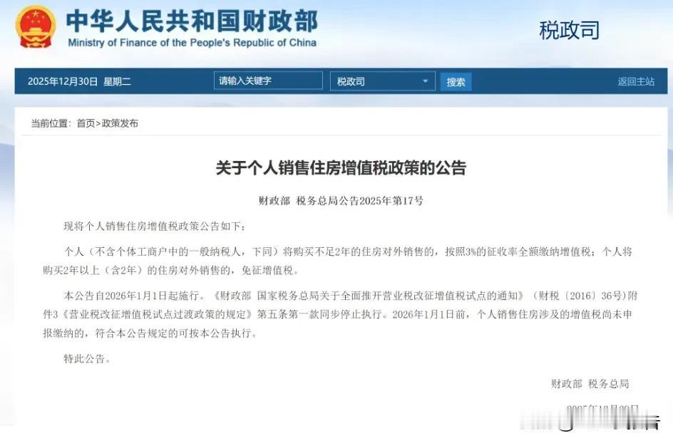 降低二手房交易增值税、同一城市卖旧换新继续退个税,2026年新年伊始,国家在税收领域继续加大支持二手房交易。 12月30日,降低了二手房交易中对于不满两年的商品房增值税,税率由5%下调到3%,这直接给交易方降低了40%的增值税税负。 而此前实行的在同一城市、同一产权人,卖旧换新的,继续执行退还个税的政策。 为了降低二手房交易成本,考虑降低或者免征契税、政府搭建免费房产中介平台,降低中介费用等措施也可以提上日程。 当房产交易以近乎零成本进行时,我相信会有力刺激二手房交易。买房增值税 二手房的交税