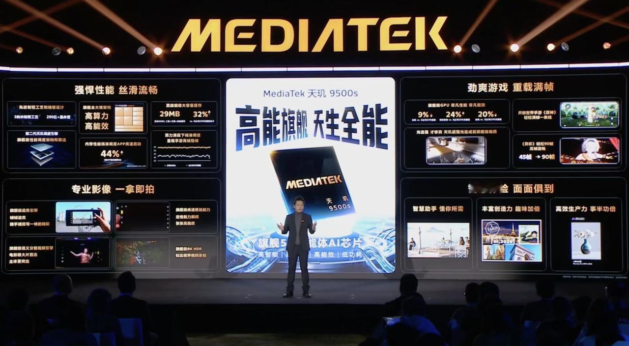 打卡联发科天玑双芯新品发布会! 开场继续秀肌肉「全球智能手机SoC连续21个季度第一」。 天玑9000系列,中国市场旗舰机占比36% 天玑8000系列,全球安卓非旗舰系列占比58% 天玑8500,N4P工艺,GeekBench多核7281,安兔兔跑分240万+,支持游戏光追,AI能力全面提升,此前荣耀手机首发。 天玑9500s,2代3纳米,290亿+晶体管,全大核,安兔兔361万,红米Turbo 5 Max首发(这是红米系列首次首发正代旗舰处理器,值得期待)。