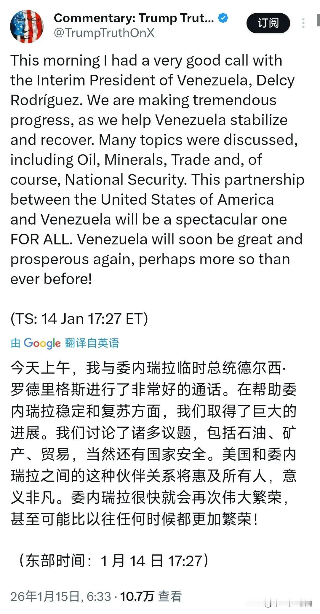 特朗普今天(北京时间1月15日)发文写道:“今天上午,我与委内瑞拉临时总统德尔西