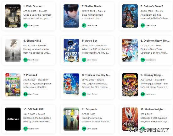 在Metacritic站上,《光与影:33号远征队》交出了一份极为罕见的用户评分成绩。 截至目前,本作在MC的User Score(仅由玩家评分构成)达到 9.6 分,位列平台历史最高(时间跨度横跨1958年到2026年,但第一款电子游戏是1980年开始收录)区间,也是近年来极少数能够在大量用户评分基础上维持这一水准的作品之一。 如果把时间缩放到近几年,用本作和其他近年大作对比的话就像这样:《剑星》和《博德之门3》均9.2分,任天堂新作《咚奇刚:蕉力全开》是9.0分,《传说之下》作者新作《三角符文》9.0分,2025的热游《超英派遣中心》和《空洞骑士:丝之歌》也分别是9.0分和8.9分