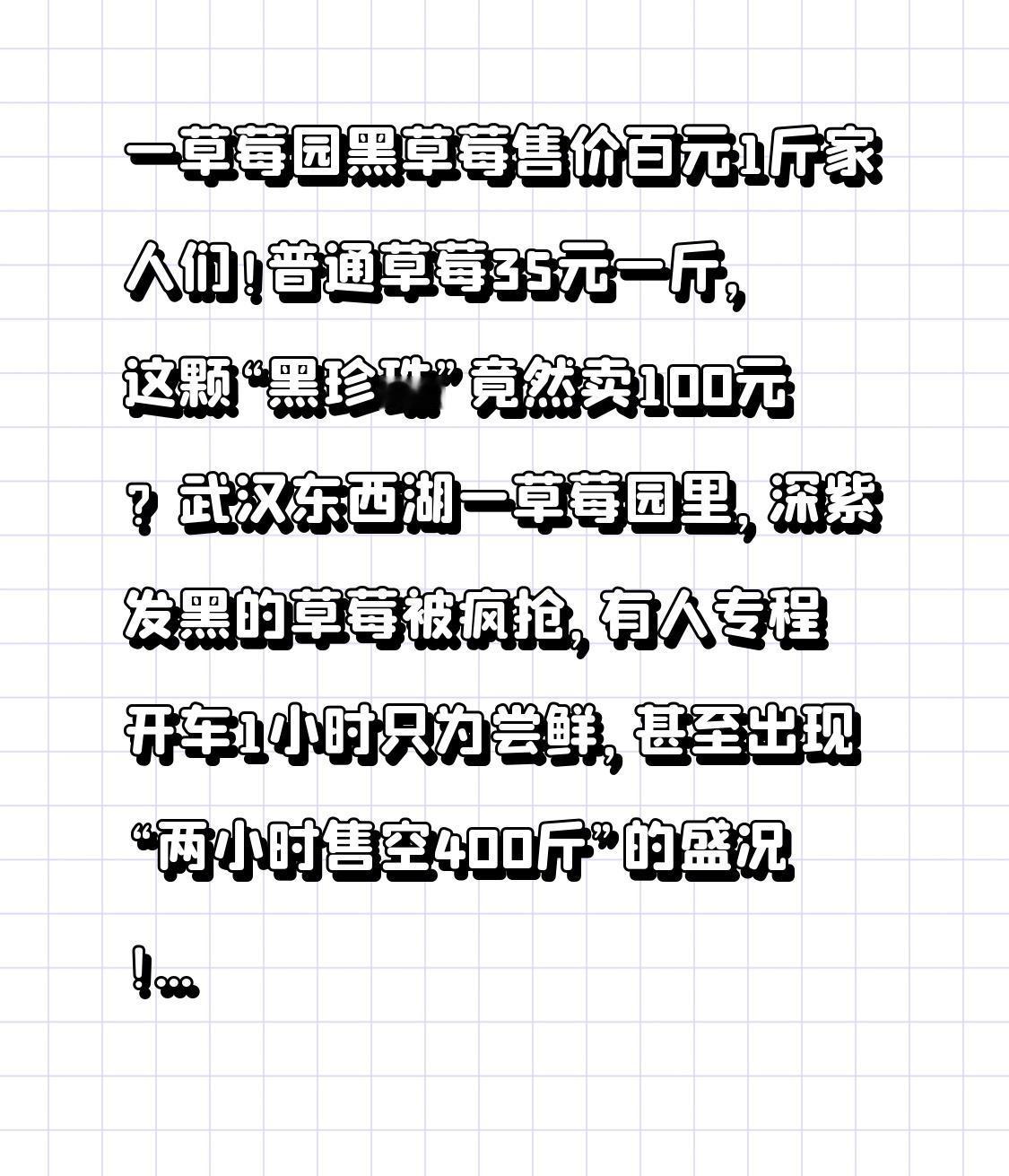 一草莓园黑草莓售价百元1斤 家人们!普通草莓35元一斤,这颗“黑珍珠”竟然卖100元?武汉东西湖一草莓园里,深紫发黑的草莓被疯抢,有人专程开车1小时只为尝鲜,甚至出现“两小时售空400斤”的盛况!一颗草莓抵得上3斤普通款,它凭什么这么贵?是真有过人之处,还是商家炒作的智商税? 走进种植大棚就懂了,这黑草莓根本不是“普通水果”!它学名黑珍珠,成熟后深紫红近乎墨色,果面亮得像涂了蜡,在绿叶间看着就像黑宝石 。但颜值只是加分项,咬一口才知道惊艳——果肉绵密得像果冻,甜度直奔20度,比普通草莓高5度以上,完全没有酸涩味,还带着淡淡的蜜桃奶香,汁水一咬就爆。更绝的是它的营养,花青素含量是普通草莓的3倍,抗氧化能力拉满,难怪被称为“可以吃的护肤品”。 但这里藏着第一个转折:贵的核心不是颜值和口感,而是“种出来太难”!园主李西军透露,他30亩地只敢种600株黑草莓,占总种植量的五十分之一,纯属“试验田” 。普通草莓一周每亩能产30斤,黑草莓拼死拼活只有5斤,单颗要长到15克以上、果形完整才算合格 。而且它娇气得很,温度必须控制在5-26℃,得喂鱼蛋白、豆饼这些有机肥料,垄沟里还要种大蒜驱虫,全程不打农药,每株只留3-5颗果,简直是“公主级待遇”。光3亩大棚的基肥就花了五六万,种植成本是普通草莓的3倍还多。 更意外的转折来了:这天价草莓竟然藏着“价格翻车史”!2022年它被炒到400元一斤,结果农户疯狂扩种,供过于求后价格直接跳水到80元,一地鸡毛。现在卷土重来,网友们分成两派:有人说“100元买一斤草莓,够我买3斤车厘子,纯属交智商税”;也有人觉得“偶尔尝鲜没问题,毕竟口感和营养摆在这,比吃保健品划算”。更有意思的是,购买者大多是新中产和带娃家庭,他们不是天天吃,而是冲着“独特体验”,摘一两斤拍拍照、尝个鲜,觉得“过年图个新鲜值了” 。 其实冷静想想,黑草莓的走红,本质是消费升级的信号。现在大家买水果,不再只看便宜,还追求颜值、口感和健康。但天价水果能不能长久,关键还得靠实力——2022年的翻车已经证明,只靠炒作噱头,迟早会被市场抛弃;只有像现在这样,把种植技术做扎实,保证口感和品质,才能留住消费者。 对于我们普通人来说,没必要跟风抢购,毕竟普通红颜草莓酸甜适中,性价比更高;但如果想给生活加点仪式感,偶尔尝一次百元黑草莓,体验不一样的风味,也无可厚非。消费的本质是取悦自己,不管贵还是便宜,自己觉得值就好。 评论区说说,你愿意花100元买一斤黑草莓吗?你觉得它是物有所值还是智商税?关注我,带你解锁更多新奇美食,看透背后的市场真相,愿每个人都能吃到心仪的美味