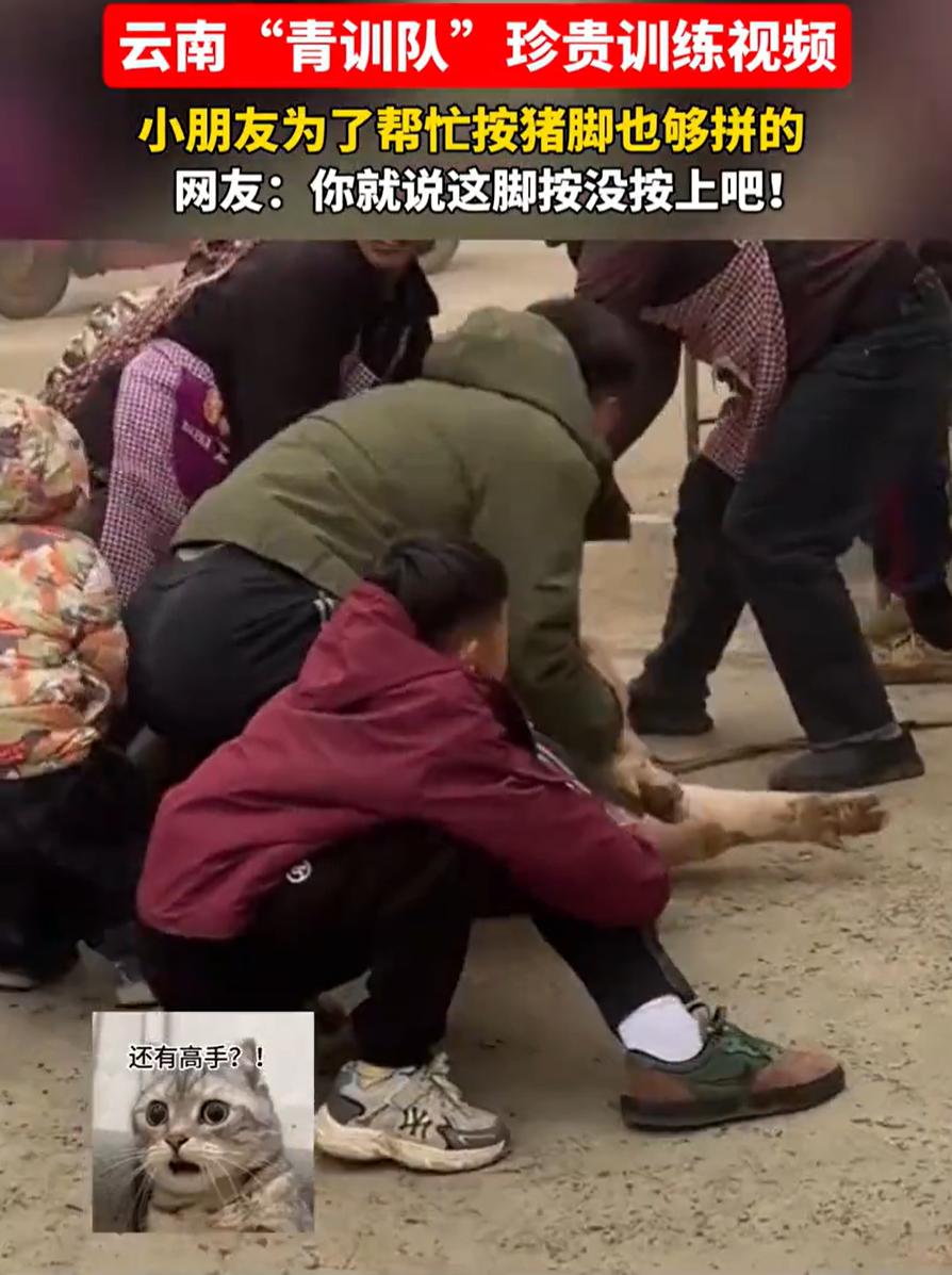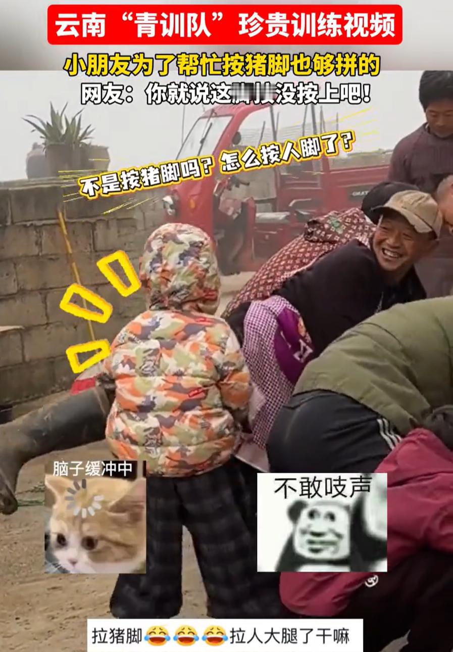 笑不活了!云南,一村民家中杀年猪,结果男子在按猪的时候,突然觉得自己的腿被人给抬起来了,回头一看,才发现是家里的孩子来帮忙按猪,结果误把大人的腿给抬起来了,帮了一把倒忙 视频中,一户村民家里按着猪准备宰杀,几个大人正使着劲儿呢,谁也没注意到,家里两个小孩也跑来凑热闹了。结果有意思的来了——别人都在按猪,这俩孩子却一人抱住一个大人的腿,使劲往上抬,差点把大人给掀个跟头 大人回头一看,真是哭笑不得。孩子脸上还特认真,一点没觉得自己帮错了地方。这场面被拍下来传到网上,好多人都乐了 有网友说,你看孩子那表情多专注,抱着腿就不撒手,真是实心眼儿帮忙 但也有网友觉得杀猪这种场面,本来就不该让孩子靠近,万一有个闪失,磕着碰着,或者被吓着了,那可不好 其实这种事在农村不算稀奇。过去条件有限,很多孩子从小就在这种环境里长大,见惯了也就没那么怕。但如今大家想法不一样了,更注意保护孩子 不过话又说回来,视频里那种全家一起忙活的场景,倒让人想起从前。那种一家人齐心干活的热乎劲,孩子为什么去抱腿?很可能就是看大人都弯着腰使劲,他们个子小,够不着猪,就想着帮大人一把,在孩子简单的逻辑里,抬腿也是在帮忙 这也是很多人看完会笑、会感慨的原因。不是觉得孩子蠢,而是突然想起自己小时候也干过类似的事。力气不够,方法不对,心却是热的,所以大家也不用上纲上线,一家人开心就好了