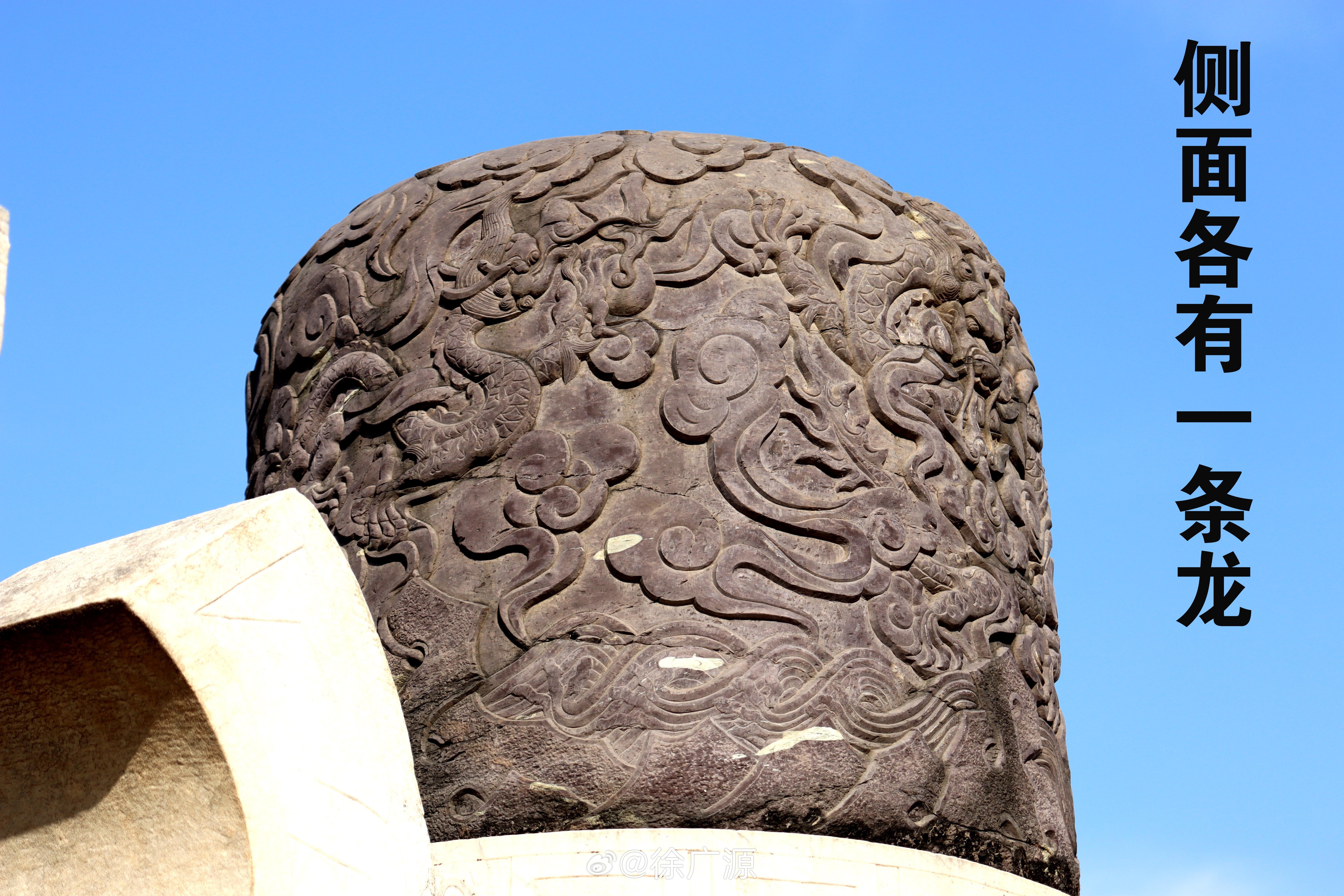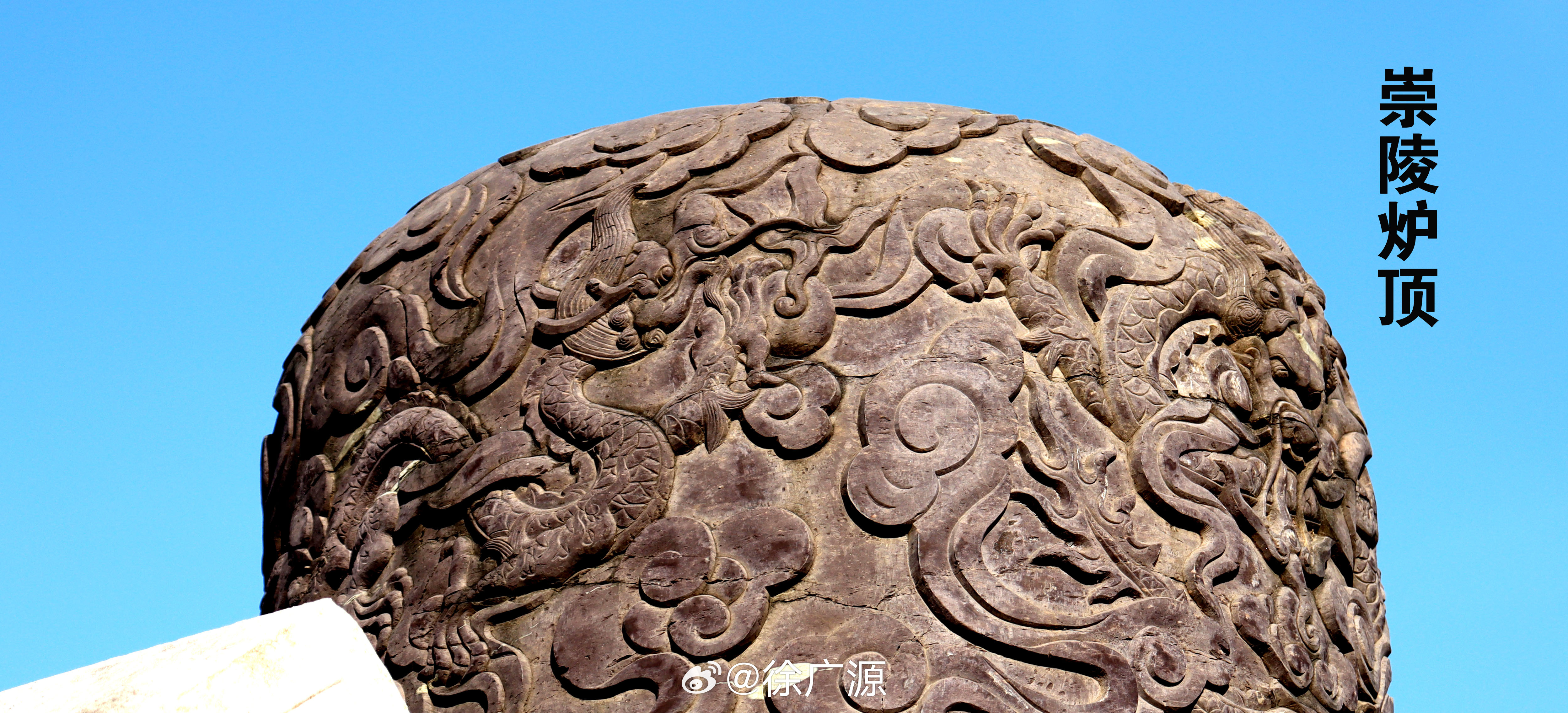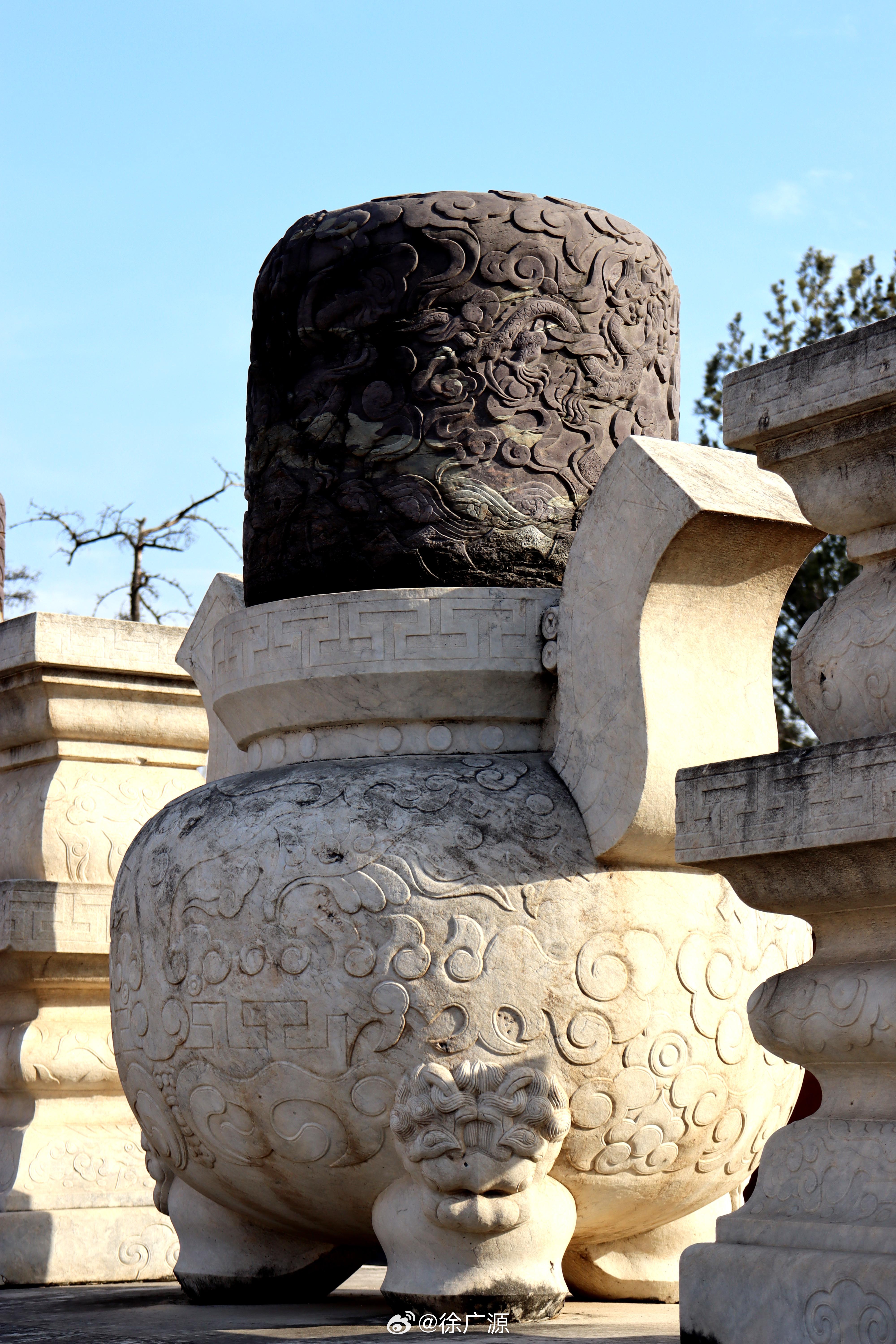前几天我曾提到慕陵石五供的香炉炉顶比较特殊,前后各雕刻一组二龙戏珠图案。前天我又托秦勤朋友去崇陵时,注意一下崇陵石五供。 崇陵石五供本来就比较特殊,2个花瓶和2个烛台都是方体的,这在清陵中是独一无二的。这次秦勤发现崇陵香炉的炉顶也是特殊的,前、后、左、右各雕刻一条龙,炉顶上共雕了 4 条龙。 其他朋友如果感兴趣的话,去崇陵时可以关注一下。 配图照片均为秦勤朋友拍照。