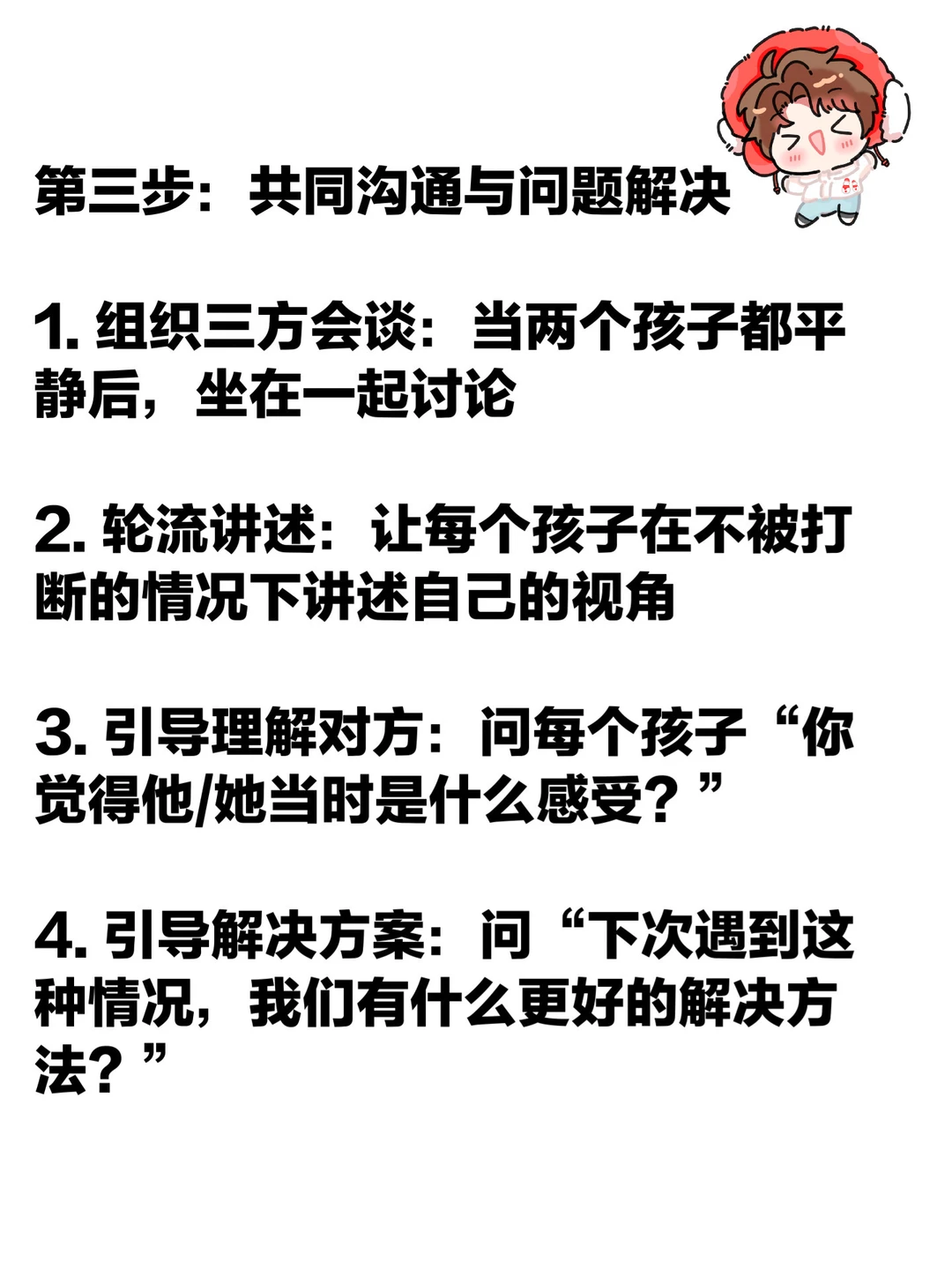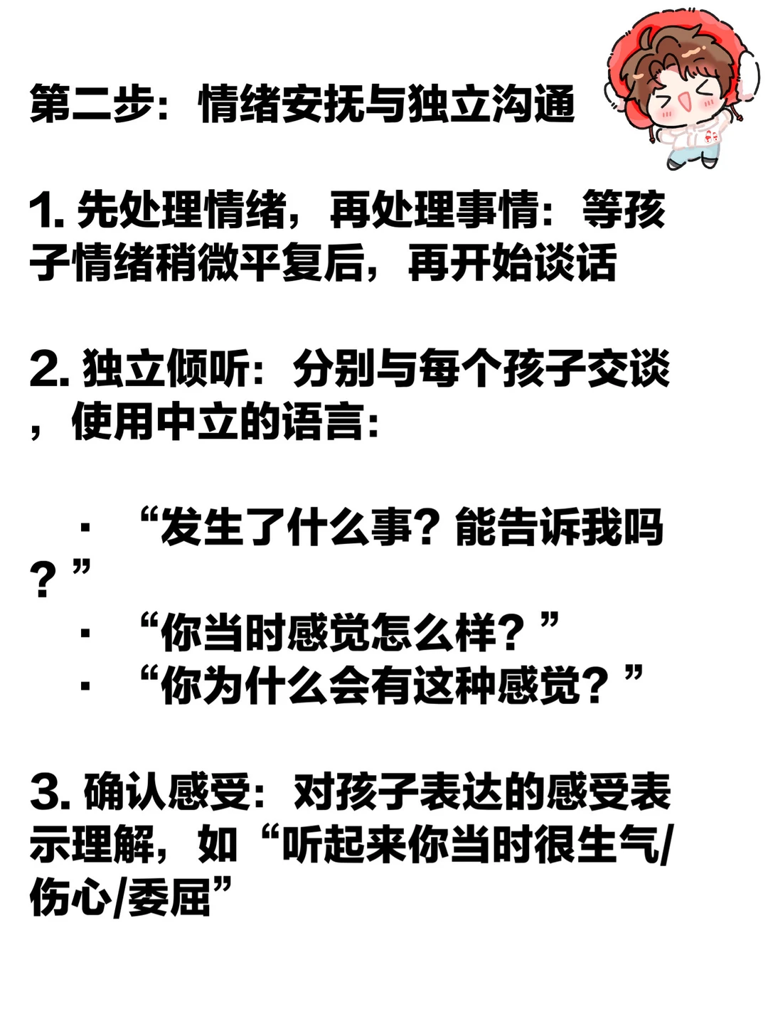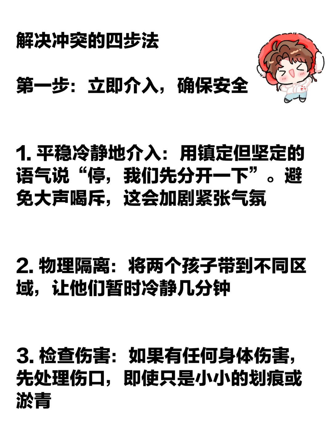 解决冲突的四步法 第一步:立即介入,确保安全 第二步:情绪安抚与独立沟通 第三步:共同沟通与问题解决 第四步:引导和解与反思