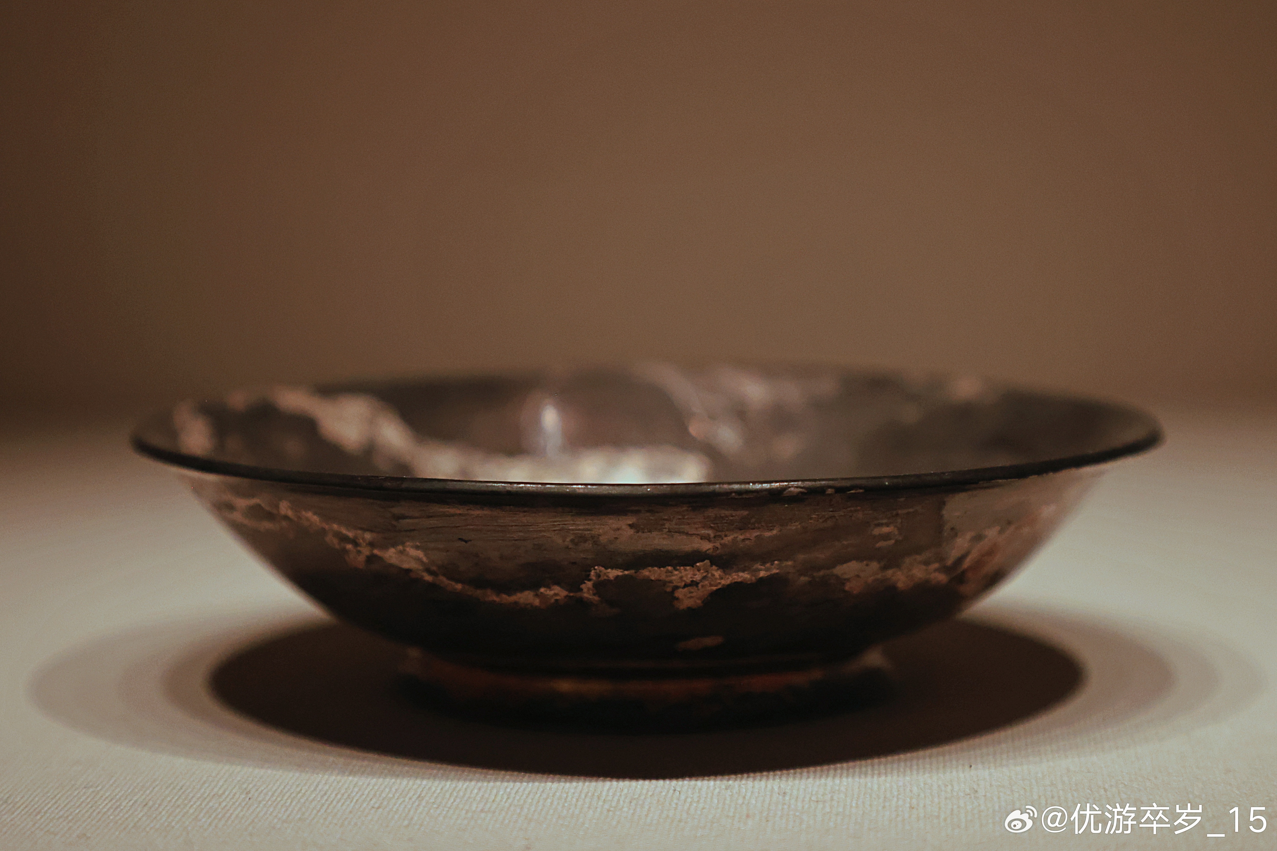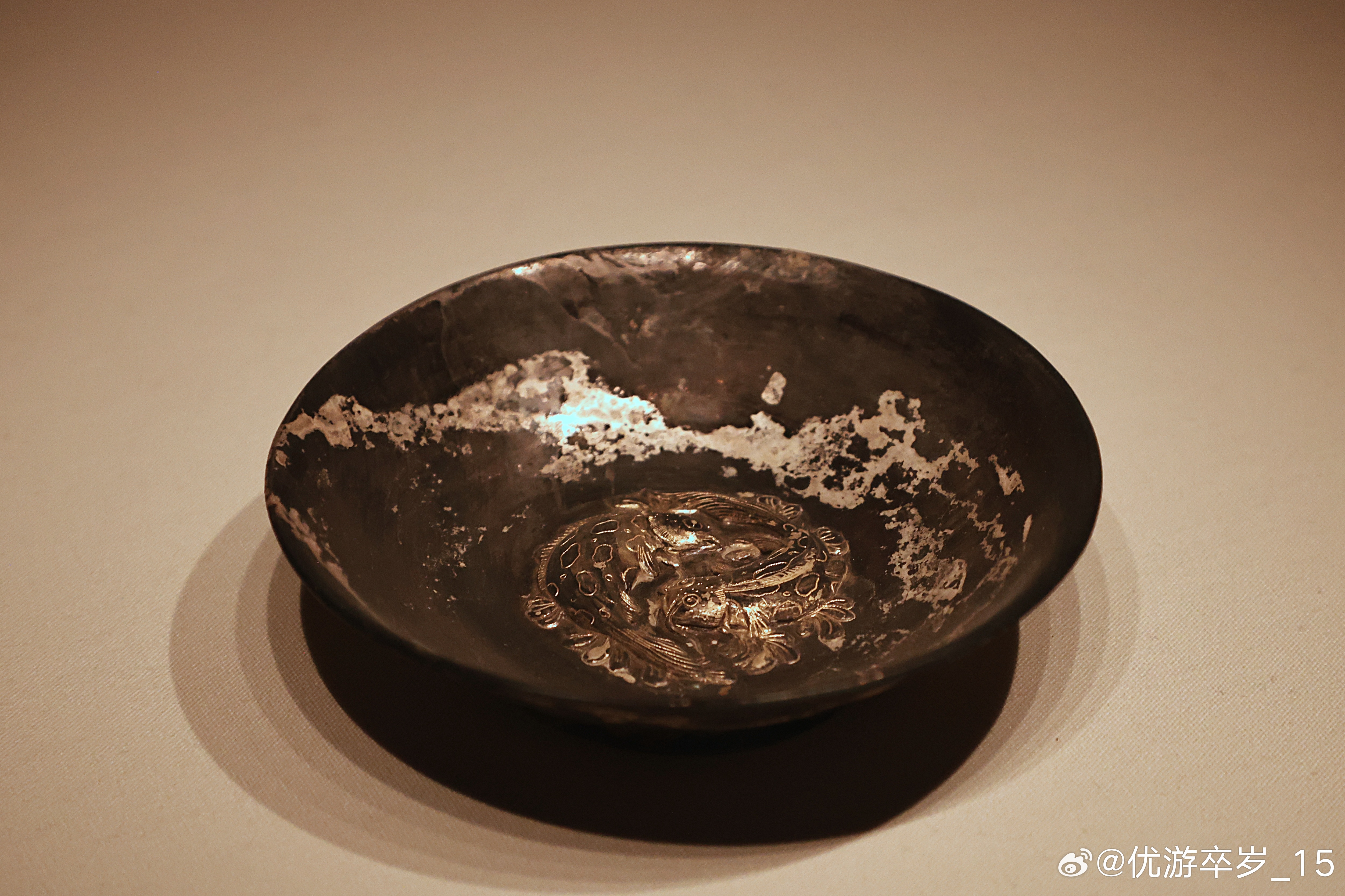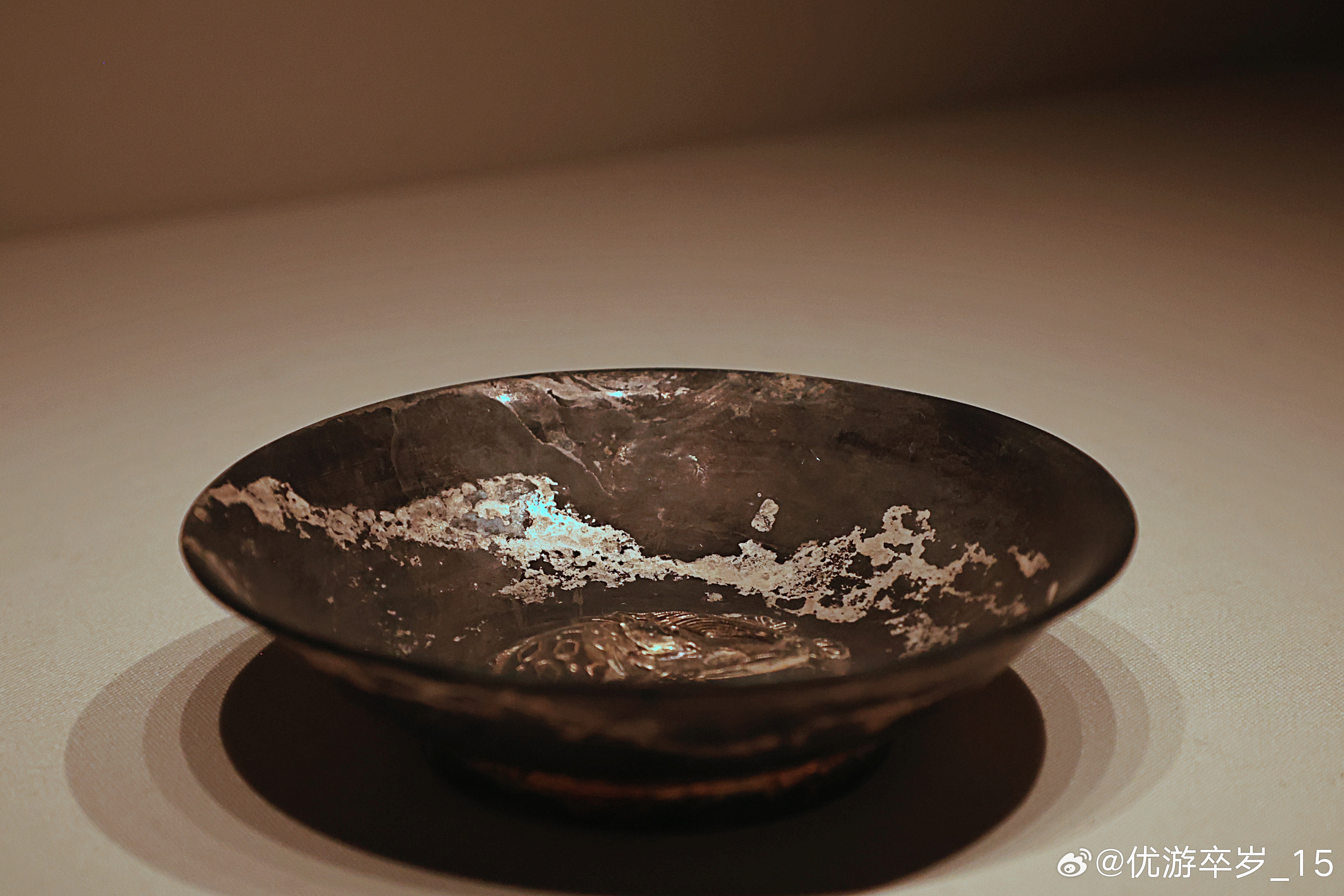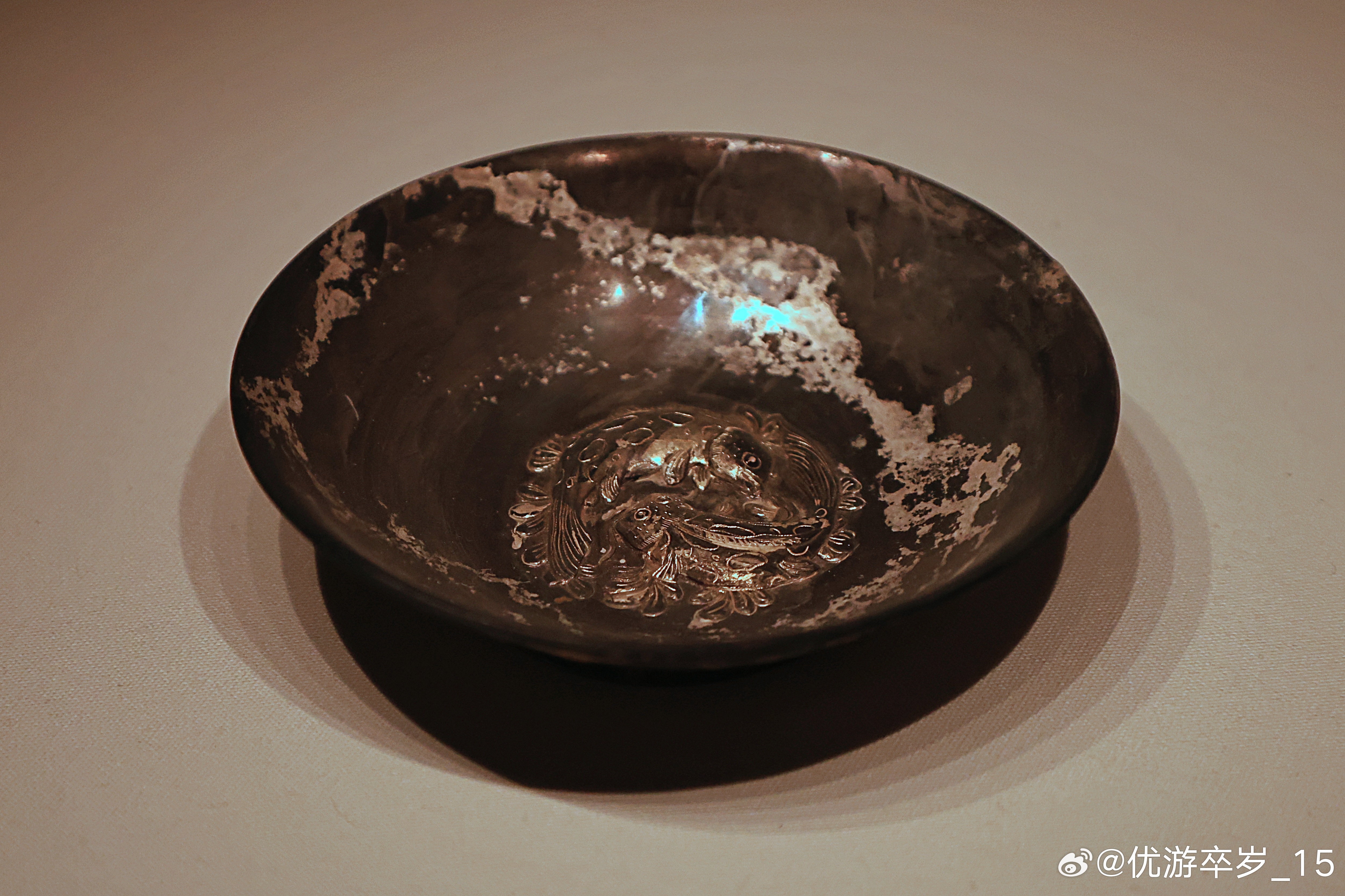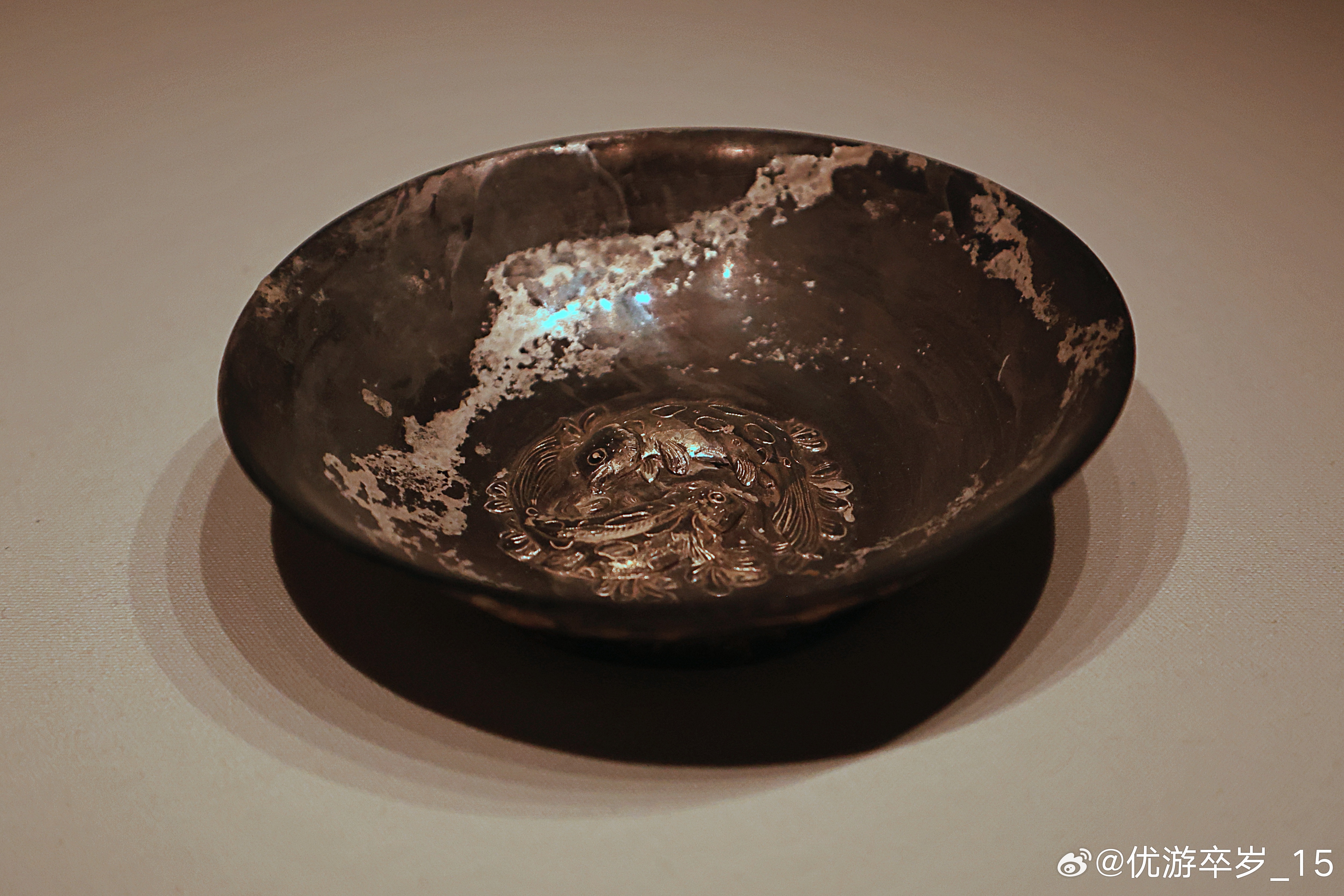双鱼金花银碗 唐 (公元618-907年)国家博物馆藏 1970年陕西西安何家村窖藏出土。银碗高约 2.7-3 厘米,口径约 11.5 厘米,重 122 克,采用捶揲、錾刻、鎏金等唐代顶尖金银器工艺。碗体经旋切打光成型,碗内底以捶揲做出高浮雕的双鱼与水草,再用錾刻细化鱼身斑纹、鳍尾,最后通体进行鎏金,但部分鎏金层已剥落,只呈现图中斑驳效果。这只碗是在粟特文化影响下由中国工匠制造出的一件中西合璧的精美工艺品,是丝绸之路文化交流的见证物。这种构图方式在当时盛行于粟特地区,但题材确已完全中国化。鱼纹作为中国传统吉祥图案,鱼、余同音,碗中的两条鱼分别是鲤鱼和鲶鱼,正好寓意“连年有余”之意。