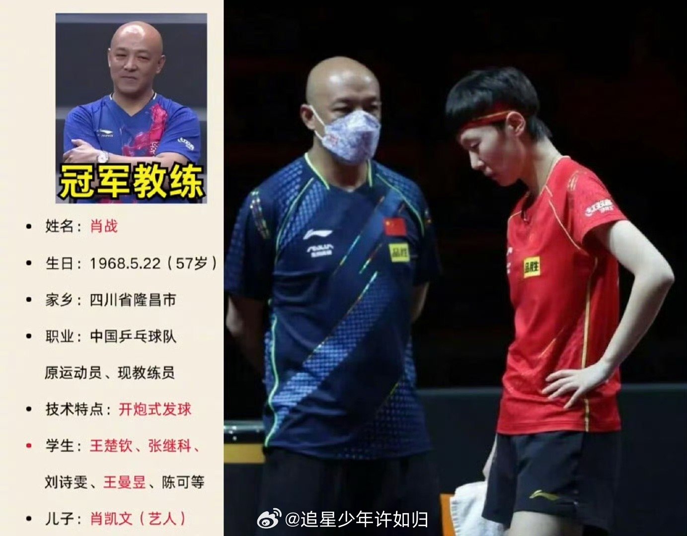 肖指导儿子进军娱乐圈了 国乒教练肖战的儿子肖凯文正式进军娱乐圈了!身高192cm,外形俊朗,确实挺适合镜头。他参加过《进步班》等综艺,目前主演了一部乒乓球题材的短剧《它在掌心,呼啸而过》。