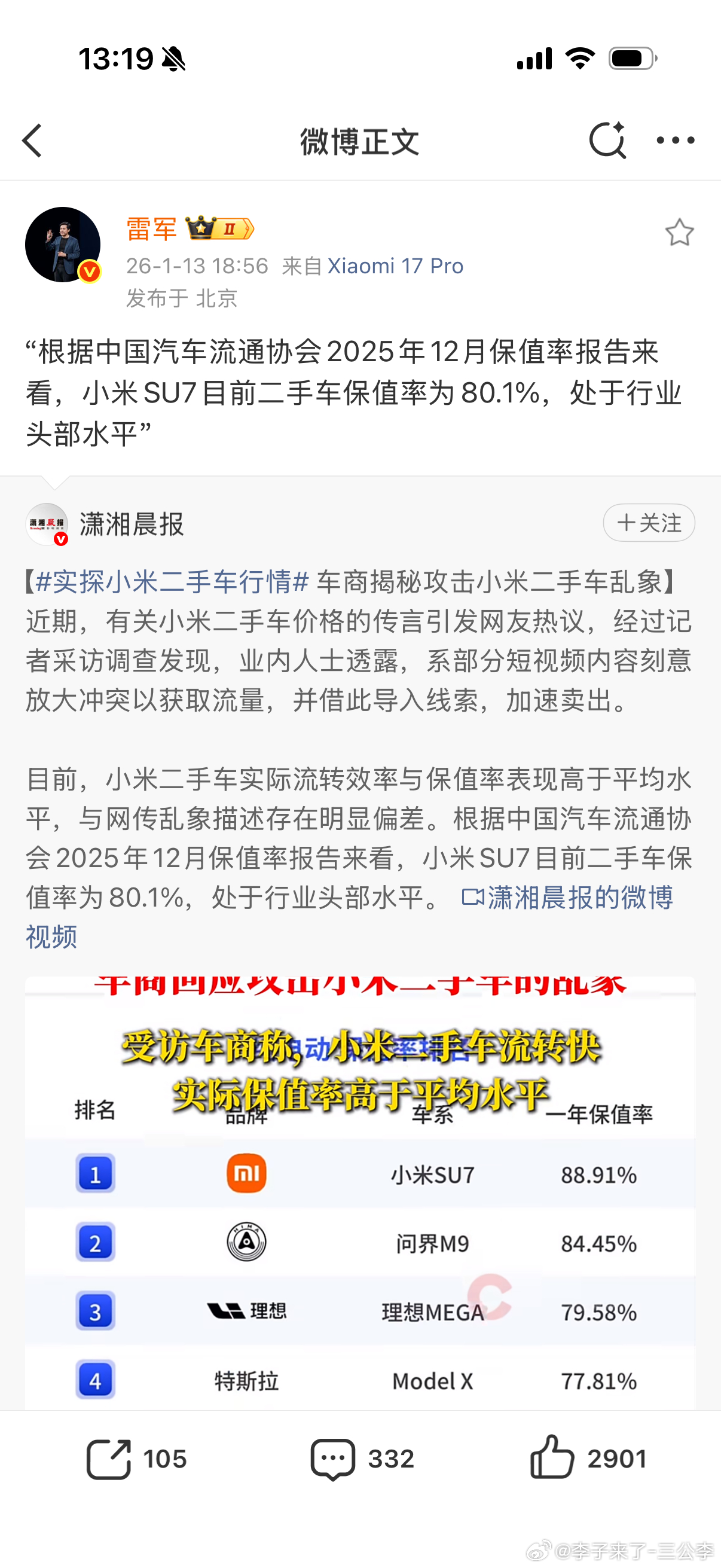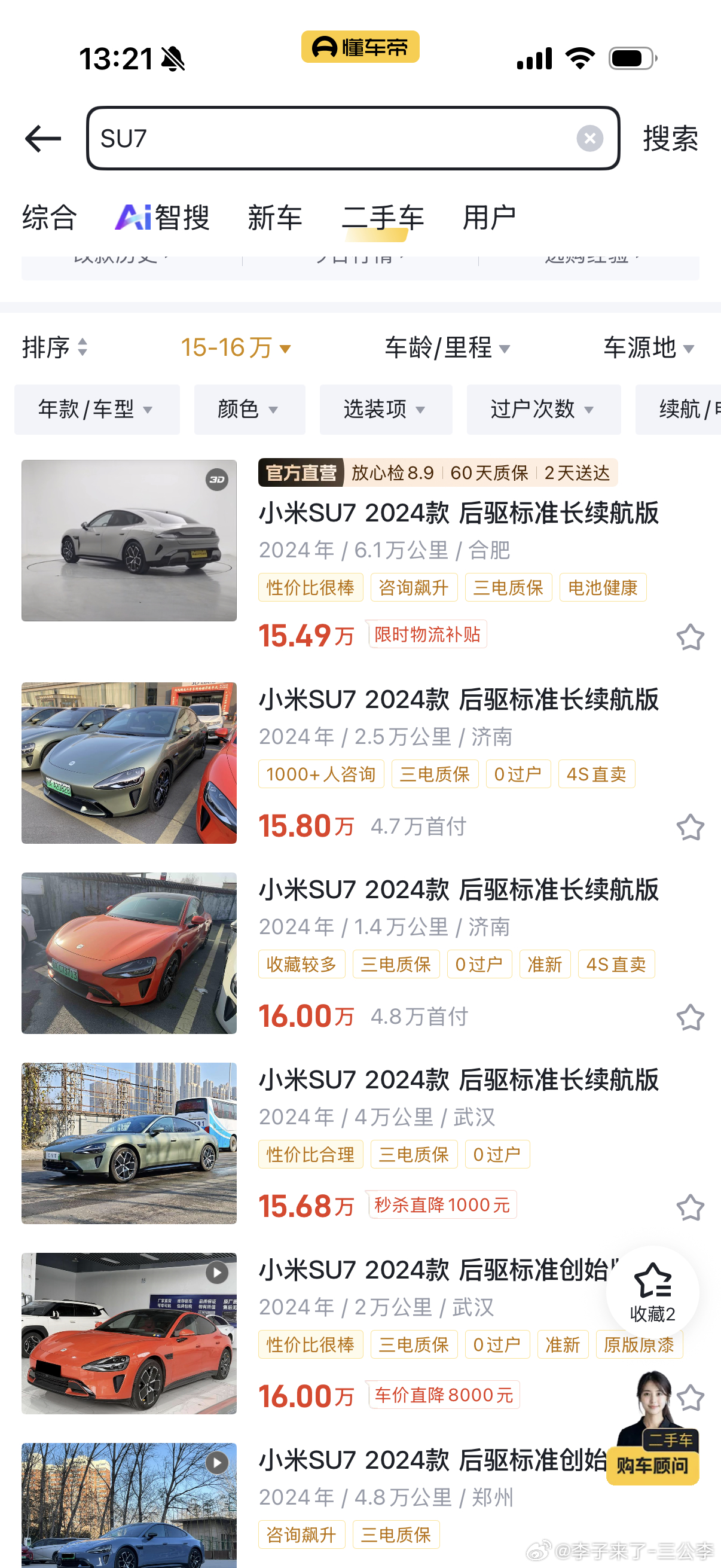 雷军回应小米二手车行情SU7保值率确实没问题非常好24年的车22万落地现在还要15.5-16万残值率一年多还剩71%非常不错了但是小米有一台车叫Ultra我兄弟买的58万 5个月亏了20万 38万出的然后现在市面上有33万标价的车子了我觉得40多万买的车商如果买来还没出可能在厕所里哭的起不来了吧?